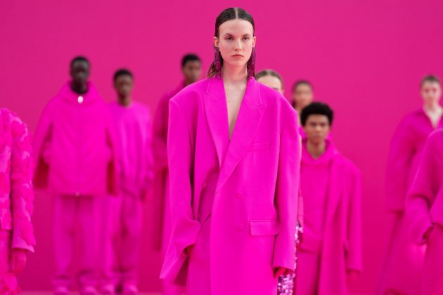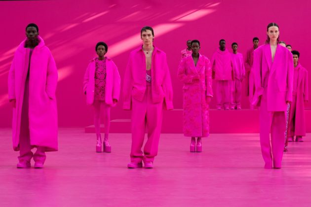 “Il rosa è la liberazione dal bisogno di dipingere la realtà in modo realistico”, dice lo stilista al termine della sfilata. “Ho voluto spogliare questo colore di tutte quelle valenze che tradizionalmente vi sono associate e rimandano a ciò che è femminile, spensierato e civettuolo. Ho voluto considerarlo un colore come un altro portando l’attenzione non più sul colore il sé ma sul lavoro creativo che è alla base della moda, i volumi, le silhouette, i tagli e le forme. L’annullamento cromatico consente l’amplificazione della varietà dei corpi, degli atteggiamenti, delle fisicità. Usare un solo colore cambia la percezione di quello che vede il tuo cervello e sei costretto a osservare le superfici, i materiali, i dettagli. Anche i discorsi sull’inclusività perdono consistenza in quest’ottica, resta solo l’autenticità delle persone”.