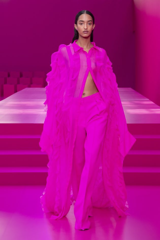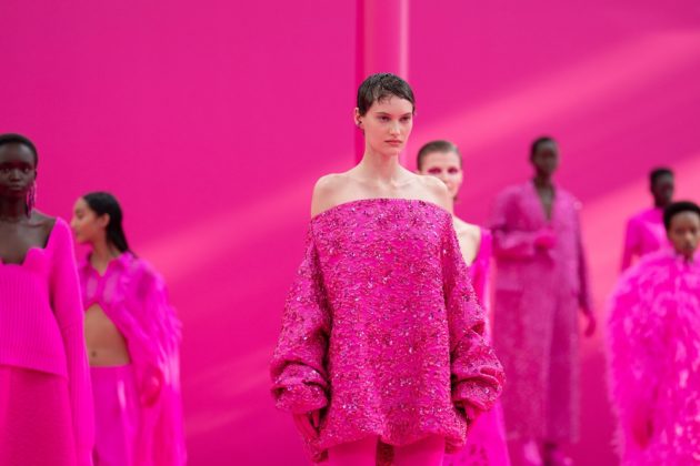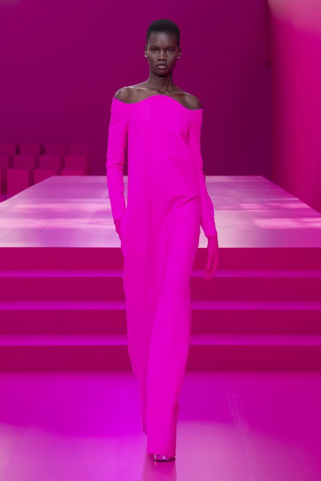 Per arrivare a questo Pierpaolo Piccioli ha compiuto un complesso processo di sottrazione: “All’inizio avevo pensato questa collezione come un continuo della precedente, la Rendez Vous. Sono venuto qui a Parigi in dicembre per cercare ispirazione ma sono rimasto deluso: non c’era la realtà che mi aspettavo di vedere, il ritorno alla vita che immaginavo non si stava compiendo nelle strade. Questo mi ha spinto a una riflessione ulteriore e leggendo gli studi di Lucio Fontana sulla monocromia ho capito che bisognava andare più in profondità, sotto la superficie della realtà, al cuore del lavoro sartoriale. Seguendo quest’intuizione sono arrivato a sovvertire il canone del rosa”.