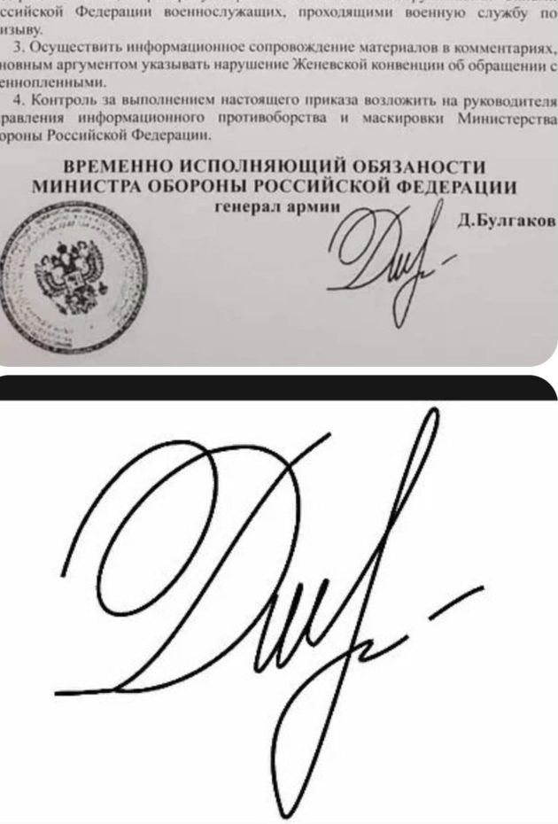Even if we assume that Shoygu is no longer in charge and there is an acting defence minister in his place, here are samples of deputy defence minister Bulgakov’s signature in letters published by Duma MP Andrey Alshevskikh on FB in 2018 and 2020. https://t.co/LmwWCSEEzq pic.twitter.com/yzkZu6HpYM
