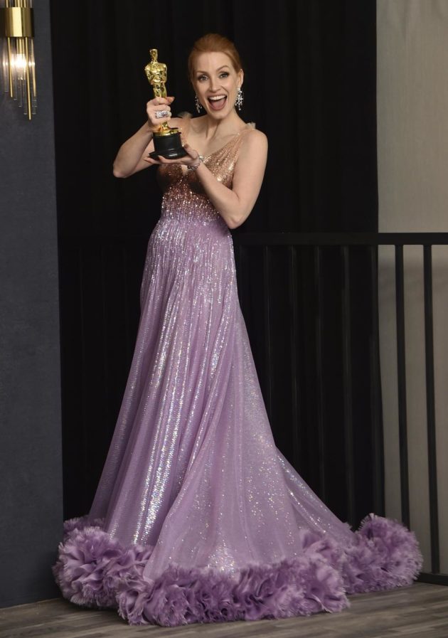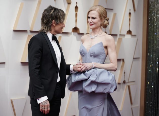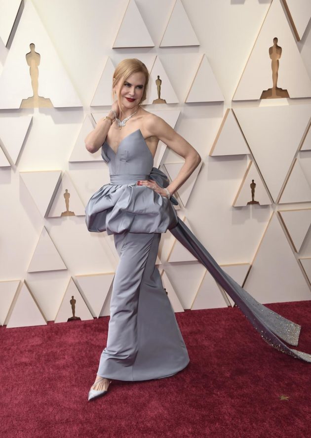 Elegantissima ed etera Jessica Chastain, che ha ritirato la statuetta come Migliore attrice protagonista in ‘Gli occhi di Tammy Faye’ con un abito Gucci interamente ricoperto di paillettes color bronzo che sfumano nel glicine, dall’orlo vaporoso. Senza dubbio una delle migliori creazioni di Alessandro Michele. Armocromia perfetta, portamento da diva: chapeau! Non si può dire lo stesso di Kristen Stewart, in nomination per la sua interpretazione di Lady Diana in Spencer: niente abiti principeschi per il suo red carpet mano nella mano con la fidanzata Dylan Meyer, ma piuttosto un completo super rock con blazer nero, camicia bianca trasparente sbottonata e – udite udite – un paio di pantaloncini anch’essi neri. Proprio così. Certo, tutto Chanel ma dopo averla vista sfoggiare abiti da sogno nei panni di Diana da lei ci aspettavamo di meglio. Una lezione di stile è arrivata invece, neanche a dirlo, da Nicole Kidman. Per il suo ritorno sul tappeto rosso degli Oscar ha scelto un sofisticato abito azzurro polvere dell‘alta moda Privé di Giorgio Armani, con corpetto a cuore, strascico, silhouette a sirena e giochi di drappeggi a dare volume sui fianchi. Semplicemente magnifica, perfetta anche nel diventare il meme della serata sui social: la sua espressione esterrefatta – letteralmente a bocca aperta – davanti al pugno sferrato da Will Smith a Chris Rock è già virale.
