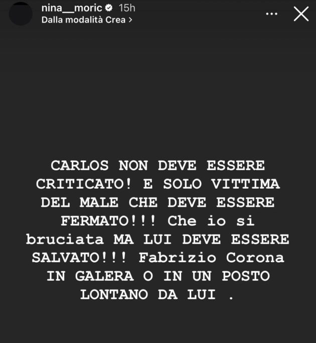 E ancora ha aggiunto: “Essendo maggiorenne non posso chiamare le Forze dell’Ordine, ma qualcuno che ha umanità deve fermare Fabrizio Corona. Siete stati in tanti a essere truffati da lui! Purtroppo chiedo la sua carcerazione! Carlos deve essere salvato! Carlos non deve essere criticato! È solo vittima del male che deve essere fermato! Che io sia bruciata, ma lui deve essere salvato! Fabrizio Corona in galera o in un posto lontano da lui!”. In seguito ha spiegato: “So che chiedo troppo, ma voglio soltanto la sua libertà a costo della mia morte. Fabrizio Corona non è mai stato un padre. Non lo sto condannando, ma mi dispiace perché non sarà mai in grado di accettare la felicità di Carlos. Fabrizio Corona si merita l’ergastolo! Non l’ho mai detto prima, ma è così”. Poi, a stretto giro, un altro messaggio quasi in contraddizione con i precedenti: “Sai cosa vi dico? Ma alla fine io cosa posso fare se il figlio è uguale al padre? Scusatemi”.