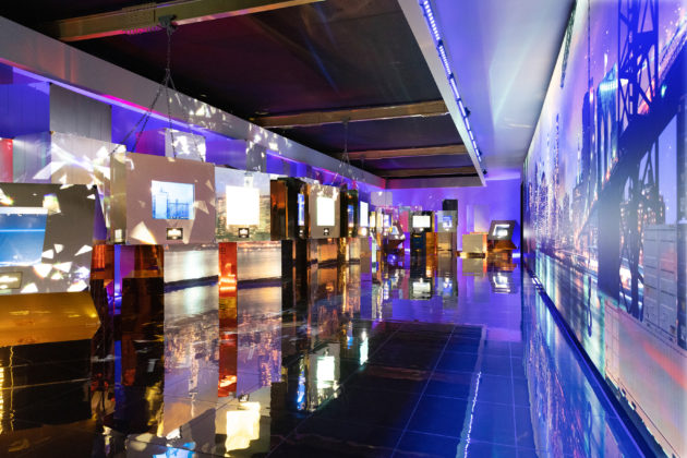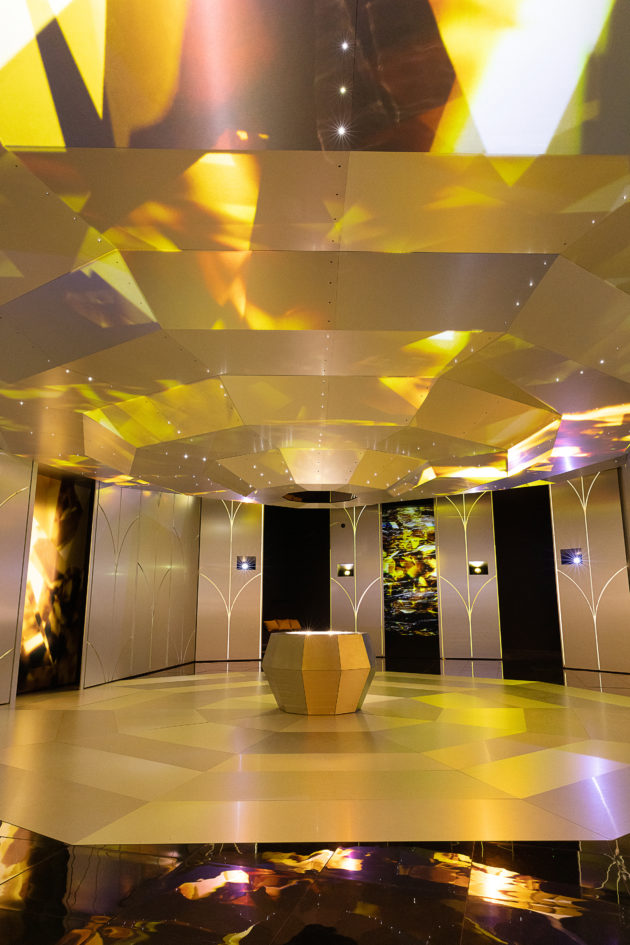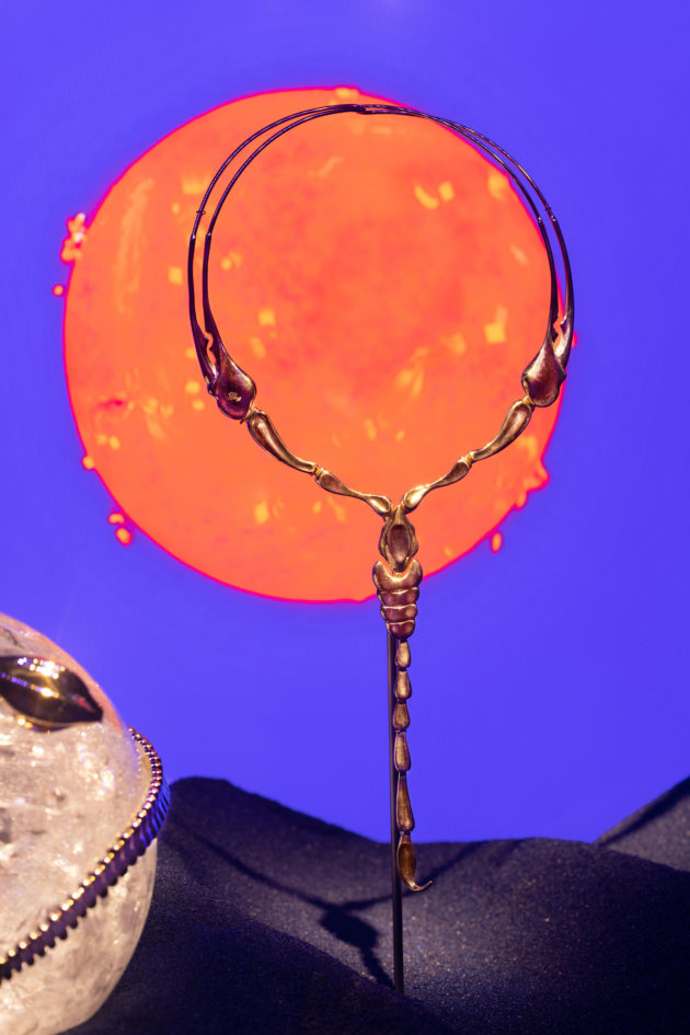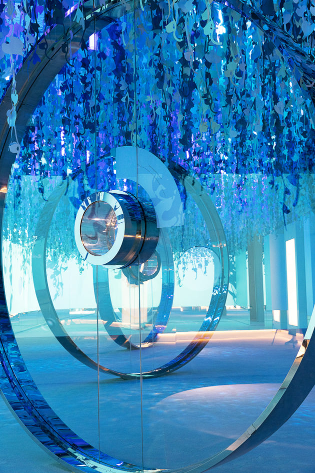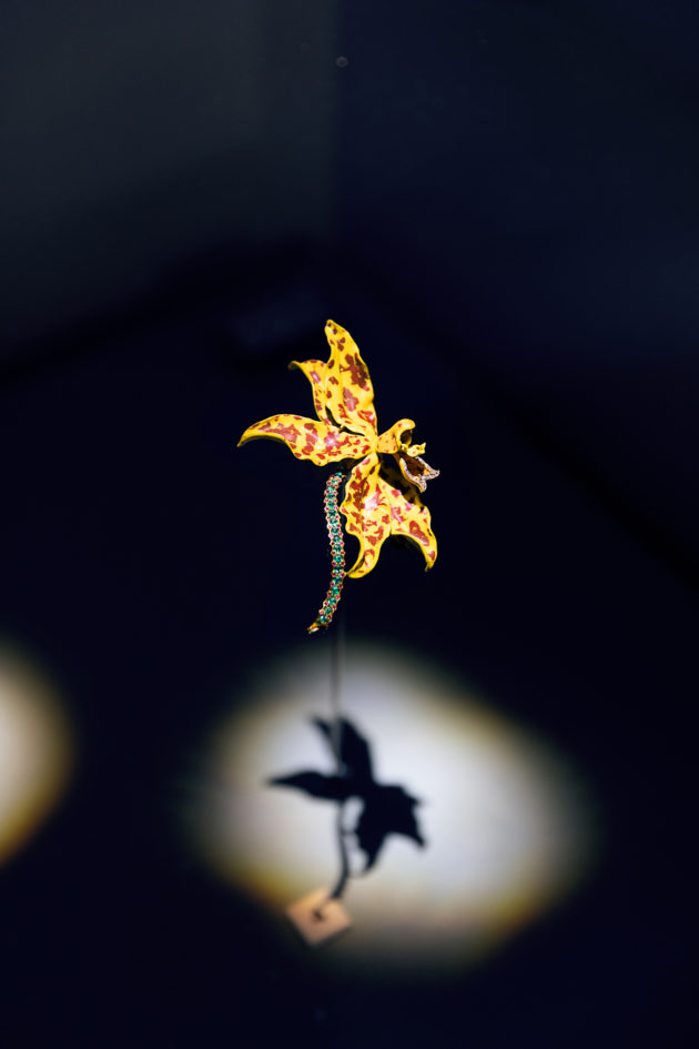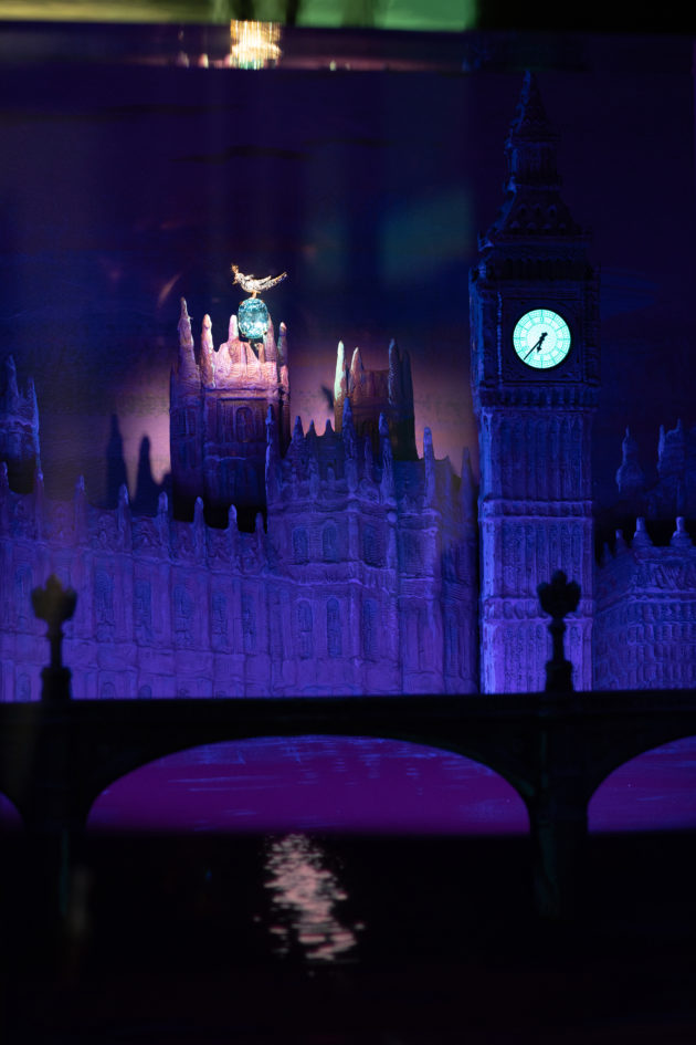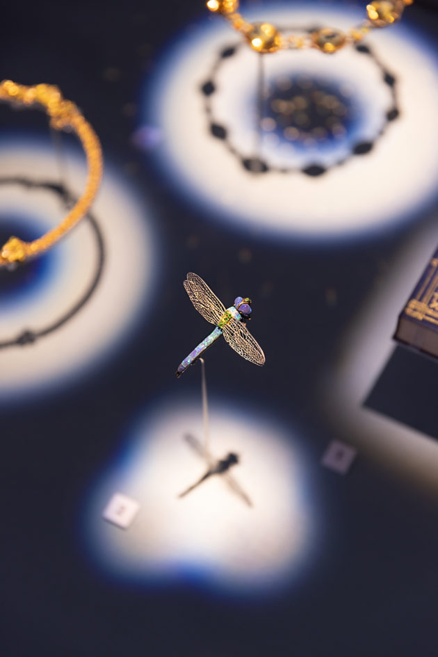 L’allestimento occupa ogni spazio della galleria a pochi passi da Sloane Square, nel cuore di Chelsea; un percorso che mette in scena tutti gli ingredienti che hanno reso il marchio famoso e sempre riconoscibile, a cominciare dall’intuizione di trasformare il concetto di vetrina, da allestimento pieno di oggetti, anche indistinti, a luogo che sceglie di valorizzare un prodotto alla volta, creando un set evocativo ad hoc. Ed è esattamente così che inizia la mostra che si dipana su sette momenti e in sette spazi diversi, mettendo in scena 400 oggetti che brillano a più non posso e fanno brillare gli occhi. Le vetrine che aprono la visita nella prima sala sono da guardare una ad una e sono pensate rigorosamente a favore di telefonino.
