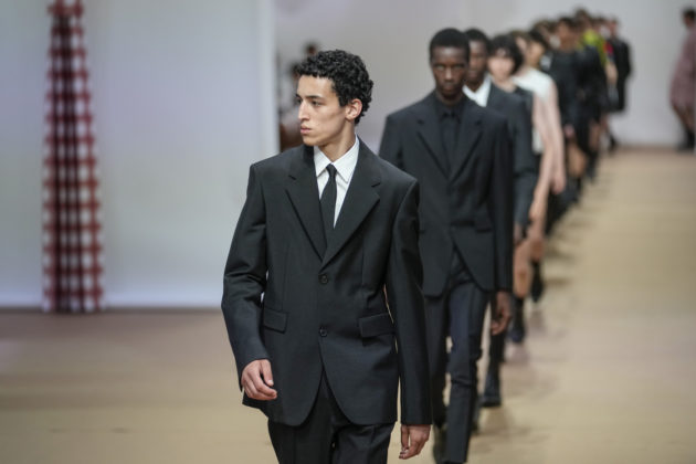 I due designer hanno fatto ancora una volta un esercizio di moda sull’uniforme maschile, concentrandosi ancora una volta su pochi pezzi studiati meticolosamente. Ecco allora che la sfilata si apre con il completo per antonomasia, con giacca abbottonata e cravatta, disarmante nella sua maniacale perfezione. I due designer hanno lavorato per sottrazione, alla ricerca dell’essenza di ogni pezzo: “I capi sembrano semplici ma sono il risultato di un processo di scelta: esistono centinaia di cappotti, perché questo è quello giusto? È a combinazione di un lungo lavoro di creazione e decisione, ma anche di istinto. E’ una questione di stile”, ha spiegato Miuccia. E così ecco sfilare una serie di soprabiti come must-have della mezza stagione, in tinta unita o a quadretti Vichy (fantasia simbolo di questa sfilata, a partire dall’invito), rosa, rossi o ancora verdi, accostati a una maglieria minima e a pantaloni sartoriali alla cui estremità spuntano stivali texani. Un gioco di contrappunti tra eleganza borghese e stilemi punk che è tutt’uno con la scenografia surreale da casetta di carta e con la colonna sonora.