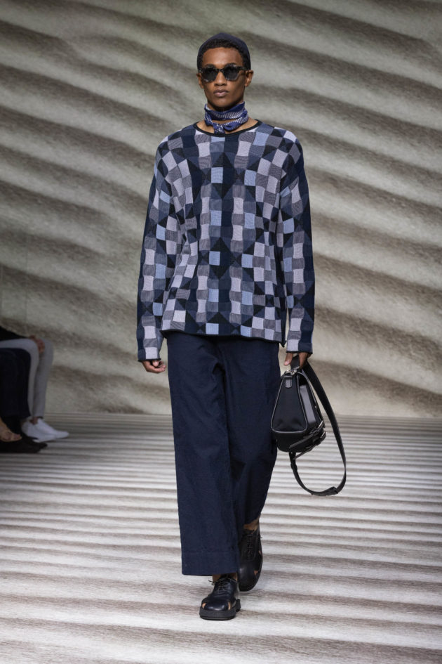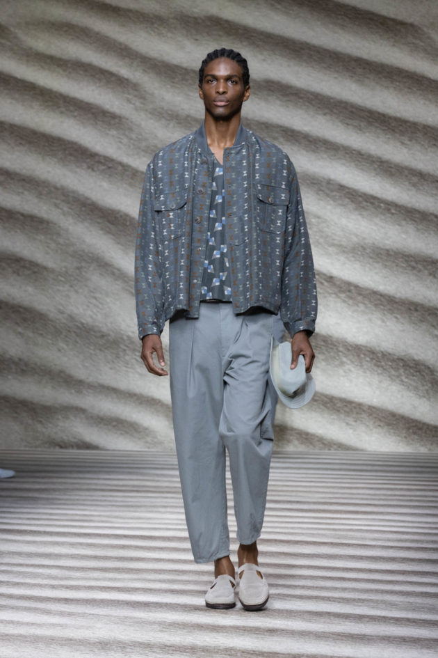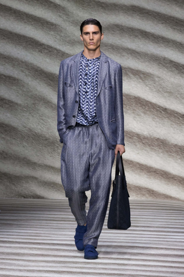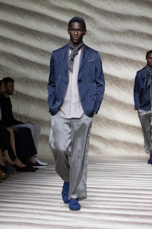 Così, tra quei particolari, troviamo le espadrillas: lo stilista le ha scelte per l’80% dei suoi look, eleggendole di fatto a capo must-have della prossima estate. Leggere, discrete, assai più chic delle sneakers, queste “pantofole” conferiscono ai suoi uomini un’andatura di rilassata leggerezza, una movenza naturalmente gentile e un’aria di disinvolta nonchalance, doti rare al giorno d’oggi. Da troppo tempo, ormai, sentiamo la mancanza di un uomo che può muoversi nella vita con questa ricercatezza autentica, fatta di attenzione e delicatezza, ma anche determinazione: i colori sono quelli per eccellenza della palette armaniana, il grigio, il bianco, gli azzurri polverosi che culminano nei verdi; e ancora, i blu in tutte le nuance, da cui saettano insoliti bagliori. “Il luccichio non è quai mai elegante per l’uomo – ammonisce “Re” Giorgio -, perchè significa il raso, le paillettes; significa relegare l’utilizzo quel capo di abbigliamento alla sera. Però qui, in questo caso, ho voluto creare un rimando con i riflessi della sabbia dorata del deserto. È quel senso di libertà che l’uomo deve avere e che non è sofisticatezza a tutti i costi. È la libertà che ognuno può e deve concedersi”.