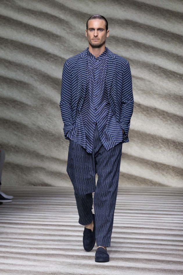“Ho cercato di enfatizzare il mio stile, il classico in chiave moderna. Che poi è tutto da discutere cos’è il moderno. Magari per qualcuno il moderno è il classico abito a doppiopetto mentre per qualcun altro lo è portare una giacca con una camicia fuori. È quello che io mi prefiggo ogni volta, di non farvi scrivere il solito Armani, ma di farvi scrivere Armani in chiave moderna, Armani 2023”. Ogni sfilata di Giorgio Armani è una lezione di moda. Quando i modelli lasciano la passerella, lui si affaccia timidamente dal backstage e, dopo essersi preso gli applausi del pubblico, non si sottrae mai alla curiosità dei giornalisti. Con pazienza ma piglio deciso, risponde ad ogni domanda con l’accuratezza di un sarto e la profondità di un filosofo, mentre il suo sguardo di ghiaccio riluce di entusiasmo vitale. Fare abiti è la passione che ha scandito tutta la sua vita ma ora è diventata quasi una sfida con se stesso. Quella di riuscire ad essere sempre coerente ma, al contempo, sempre nuovo, all’avanguardia. E nell’epoca dell’iperistantaneità che rende ogni cosa già vecchia un secondo dopo la sua nascita e dell’ossessione per l’attenzione, questo suo esercizio di stile appare come una vera impresa. Ed ecco allora che per questa collezione uomo Giorgio Armani Primavera/Estate 2023, il “Re” ha voluto osare ma senza strafare, facendoci pregustare quelle sensazioni di gioia pura che questa stagione sprigiona proprio come i gelsomini al calar del sole.