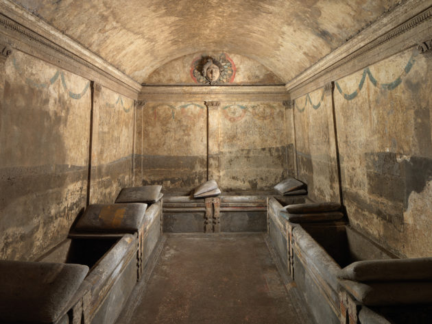 Quasi un centinaio di gradini, anzi gradoni, scolpiti nel tufo che conducono nel ventre molle e poroso della Sanità. In realtà l’antico sepolcro fu scoperto, integro nelle pitture e nel ricco corredo funebre, dal Barone di Donato nel 1889, artefice involontario di un ritrovamento incredibile. Oggi si accede al sito scendendo tramite una scala a 11 metri sotto il livello stradale per immergersi in un mondo “sotterraneo” ancora vivo, ricco di decori e stucchi, 700 pezzi, colori vivaci e raffinatissimi effetti di trompe l’oeil. E’ già diventata icona la ragazza con il rossetto, la miss dell’ipogeo, un’influencer ante litteram, intatta nella sua modernità. Ringraziamenti a fiume all’ombra del Toro Farnese nella sala principale del Mann.