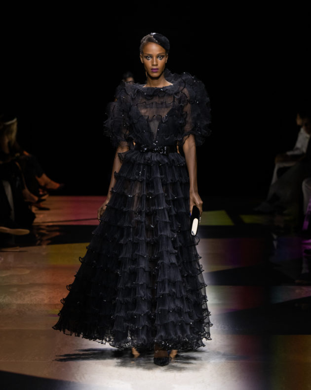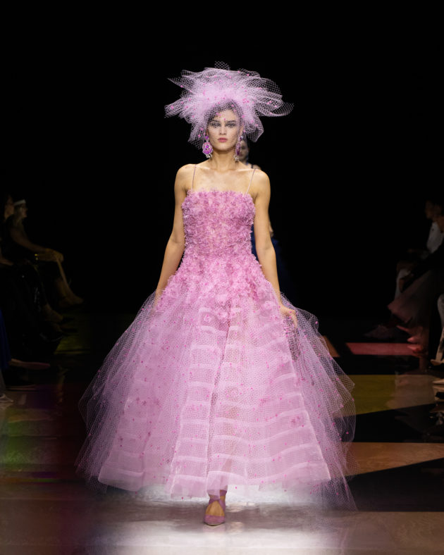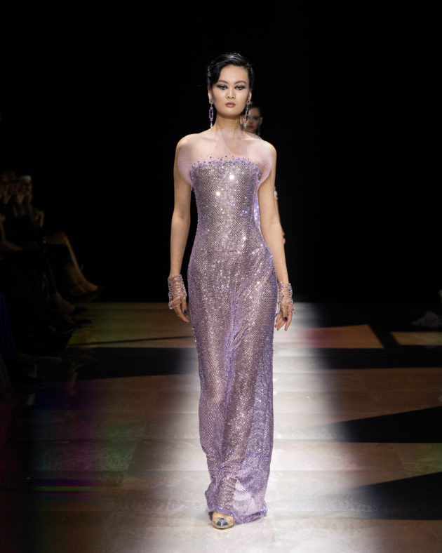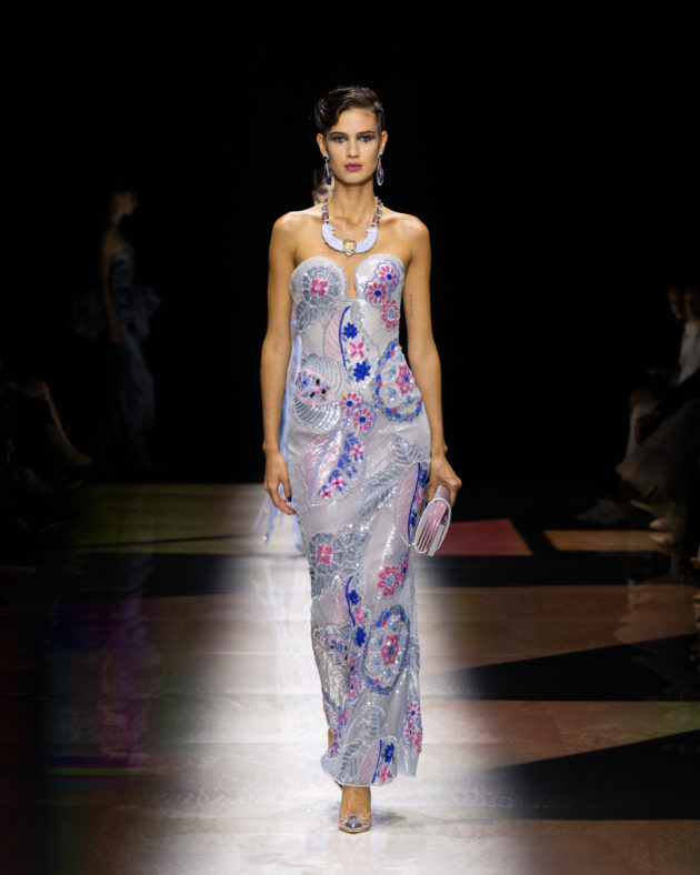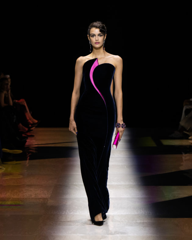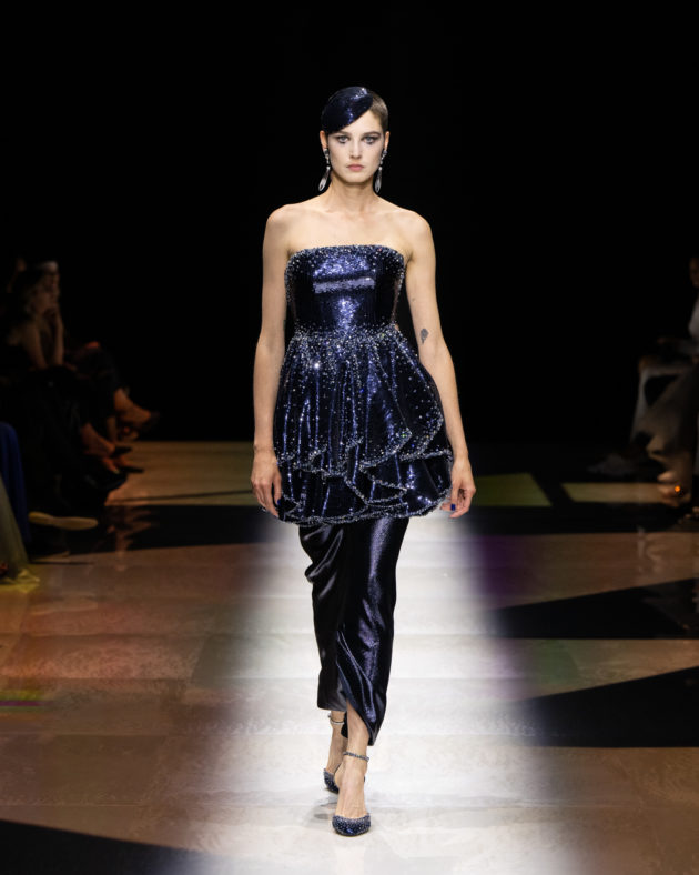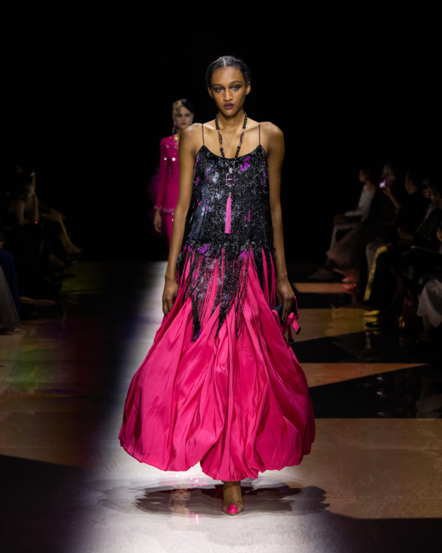 “L’idea di base arriva da certi film americani, dove una coppia va al cabaret. C’è un stanza con luci soffuse, musica di sottofondo, qualcuno che sussurra, qualcuno che si bacia…”, racconta Giorgio Armani aprendo le porte del backstage ai giornalisti poche ore prima dell’inizio dello show. “Certo, nessuno va più al cabaret, vanno tutti in discoteca, vanno da altre parti, ma penso a una donna che esce senza mai camuffarsi. Ho voluto esasperare queste atmosfere, aggiungendo anche un tocco di dolce allegria, raccontando il piacere sottile di godere della vita. Una nuova storia che si traduce in un’immagine di una donna che vuole essere sofisticata, in maniera, diciamo, anche spiritosa, non sussiegosa, ma spiritosa. Spero di rinnovare un modo di essere che adesso non c’è più”, spiega mostrando i dettagli dei capi che accarezza con amore paterno. “Sapete – confida poi – , ieri sera ero al ristorante e non riuscivo a smettere di osservare le donne presenti. Sono rimasto davvero amareggiato dal vedere come rovinino la loro bellezza tra ‘ritocchini’ e abiti volgari: è questa la ragione per cui ho creato questa collezione, per rinnovare uno stile, un’idea di femminilità autentica che adesso non c’è più. Si è persa, proprio come i cabaret”. E così, tutto questo si traduce in un’esperienza multisensoriale fatta di abiti intessuti di meraviglia, tempestati di cristalli che scintillano sulle gonne illuminando il tessuto scuro come stelle nella notte. È un tripudio di luci, bagliori e riflessi, che si irradiano nello spazio sprigionando tutta la potenza del femminile assoluto e atemporale. Dai toni accesi ed energici dei rosa che ricordano i cieli infiammati di tramonti lontani, all’azzurro etereo che sfocia nella profondità senza fine dei blu e del nero per eccellenza: Armani detta così la via di fuga verso il sogno e la magia, abbandonandosi alla creatività incontaminata che da sempre caratterizza le sue collezioni Privé. C’è spazio per lo scintillio, per i lustrini, per una misurata frivolezza di calviniana memoria, elementi che ci teletrasportano nei ruggenti anni ’20, la decade iconica che ha visto le donne affermare la propria indipendenza e riscattarsi in modo volitivo e brillante mentre sbattevano sensualmente le ciglia scure di mascara ancheggiando nei loro abiti-sottoveste in satin. Un po’ come Tamara de Lempicka, musa dell’art decò passata alla storia con l’immagine che lei stessa ha voluto affermare nel suo autoritratto.