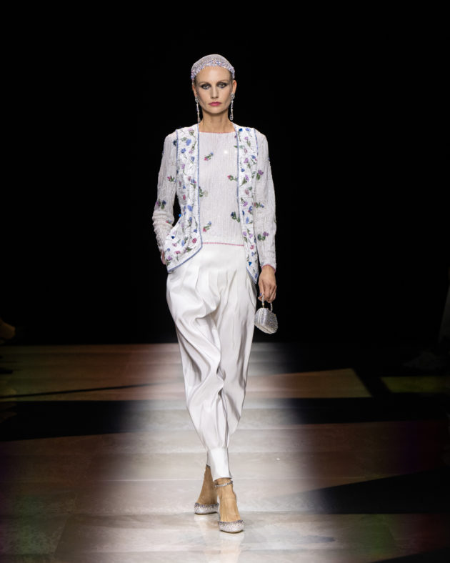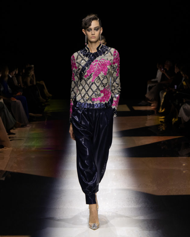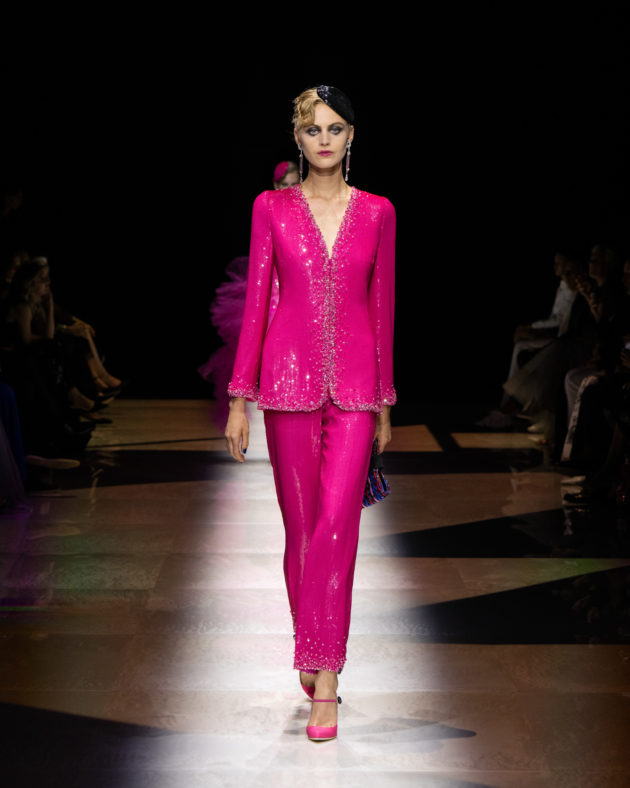 Il fulcro di questa poetica armaniana sta nel lavoro di studio accuratissimo che lo stilista ha fatto sulle silhouette, facendone l’emblema di questo connubio ossimorico tra femminilità e desiderio di ribellione: sono serpentine, fascianti e avvolgenti sulle forme, ma anche vaporose ed evanescenti. Le gonne “a sirena” tipiche dell’estetica legata al mondo del cabaret sono qui spezzate da lame di colore, c’è il fucsia che si sprigiona dal nero, e i tessuti – dal velluto impalpabile alla seta più leggera – si muovono al ritmo dei corpi in un fruscio di sottofondo ipnotico. C’è un gioco di stile sui corpetti, focus della collezione, che si animano di frange di canottiglie dai rimandi ora Gatsbiniani ora gitani, accostati a pantaloni sartoriali chiamati a fare da contraltare nella calibrata provocazione di Armani. E poi le giacche, immancabili, in fantasia optical o attraversate da preziosissimi ricami che rimandano all’Oriente conferendo al look un’aria che “Re” Giorgio definisce “esoterica, più che esotica”: ”Perché sappiamo che il modo occidentale di vestire rischia sempre di essere un po’ stiff, un po’ secco e severo”. Il colpo d’occhio emana pura energia femminile: la stessa che lo stilista ha voluto concentrare nell’ultimo look. Dopo aver sfoggiato una gamma di sfumature intense e brillanti, ecco che fa la sua comparsa un completo pantalone bianco coronato da una preziosa calotta di diamanti. Accecante, purissimo, disarmante: è la summa di tutti i colori, le forme e le suggestioni viste negli abiti precedenti. È l’ultima provocazione di Giorgio Armani, che con questa sfilata si prende la standing ovation del pubblico esploso in un fragoroso e interminabile applauso appena lo ha visto fare capolino in passerella. Poi, con gli occhi lucidi, torna dietro le quinte. Ma non prima di aver dato precise indicazioni a fotografi e modelle per la foto finale di rito.