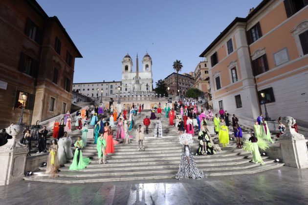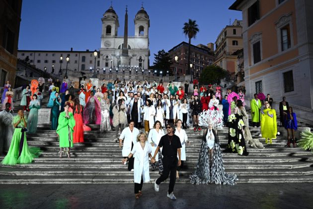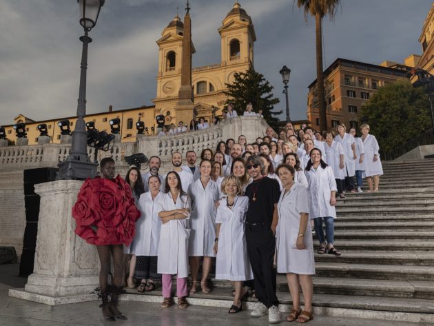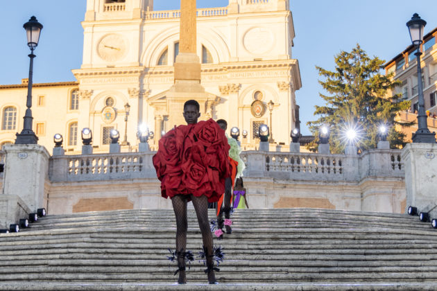 “In questo mondo che sta cambiando, dobbiamo rispondere con la bellezza alla democrazia che ci viene negata”. È un’immagine oltremodo potente quella che Pierpaolo Piccioli ci regala con la sua ultima sfilata d’Haute Couture Autunno/Inverno 2022-23 Valentino The Beginning: la scalinata di Trinità dei Monti, in piazza di Spagna, è tornata ad essere per una sera il centro del mondo, facendo da sfondo – 35 anni dopo l’ultima volta – alle creazioni di Maison Valentino. La luce calda del tramonto ricade languidamente sulle facciate dei palazzi circostanti facendo risplendere i monumentali gradini di marmo, mentre nell’aria vibrano le note intonate dalla voce potente di Labirinth: i modelli sfilano partendo da via Gregoriana, poi giù lungo la maestosa scalinata per poi rientrare in Palazzo Mignanelli, la sede dell’atelier, dove tutto ha inizio. Seicento metri di passerella per 102 capi indossati da altrettante persone rappresentative dell’umanità contemporanea senza alcuna distinzione di razza, genere, età o taglia. La magnificenza del passato si rivolge al futuro focalizzandosi sul momento presente. E la fotografia finale è l’istantanea di una couture che può, e deve, essere diversa: “Credo che vedere oggi qui, dove un tempo regnava un certo canone di perfezione, 45 modelle di colore, altre 20 asiatiche e uomini che scelgono liberamente di indossare abiti femminili, sia molto più forte di qualsiasi cosa che possano dire i vari Salvini, Meloni o Trump”, spiega il direttore creativo. “La bellezza – sottolinea accogliendo i giornalisti nel suo studio di Palazzo Mignanelli – nasce dall’armonia. Non è una dittatura estetica, non obbedisce a canoni rigidi, a regole prefissate. La bellezza è un modo, ed è al centro del modo di fare della maison Valentino, sin dalla fondazione. E io voglio mostrare una bellezza diversa in un mondo dove la democratizzazione viene negata. Guardiamo a cosa è successo negli Stati Uniti: non è stata calpestata solo la dignità delle donne. Sono stati violati i diritti umani. Per questo penso che sia importante reagire con la bellezza e la creatività: scendendo dalla scalinata di piazza di Spagna tutto ciò che viene visto come periferico esce dall’oscurità e acquisisce subito centralità. E nell’alta moda non ci sono modelli o pregiudizi, né tantomeno ostacoli al pensiero”.