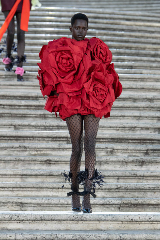Tutto questo si traduce in una collezione sublime che segna un nuovo inizio per lo stilista di Nettuno: dopo 23 anni di esperienza e lavoro al fianco di Valentino Garavani, consacra con questa sfilata la sua maturità creativa. E la sua libertà di esprimere pienamente se stesso. “L’ho intitolata The Beginning – racconta ancora Pierpaolo Piccioli – perché per me è davvero un inizio. Sono passati 23 anni da quando sono arrivato qui, la scalinata è sempre la stessa, ma sono cambiate le persone, il mondo. Io invece sono rimasto e voglio continuare ad essere lo stesso ragazzo che arrivava da Nettuno col treno e guardava folgorato Dalma con un abito di Valentino scendere la scalinata a Donna sotto le stelle. Stavo dietro le transenne dalla mattina. Poi dormivo alla Stazione Termini e l’indomani prendevo il treno e tornavo a Nettuno. Per questo ho invitato 120 ragazzi delle scuole di moda romane. Dalla strada si può continuare a sognare. La forza della creatività sta nello spazio che intercorre tra realtà ed immaginazione”. Ma la scelta di Roma, di Piazza di Spagna dove Garavani sfilò per primo nel 1985, non vuole essere un mero omaggio al fondatore della maison, quanto piuttosto il culmine della conversazione ideale con la sua immensa eredità che Piccioli ha portato avanti in tutti questi anni di lavoro a Palazzo Mignanelli. “La vita, le persone, le nostre storie e le nostre identità risiedono qui. Apparteniamo a questo luogo tanto quanto esso appartiene al mondo e a Valentino”, spiega.