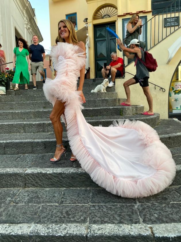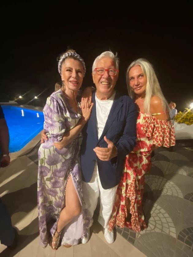 Sono in piazzetta e mi basta vedere lo struscio: sembra una bomboniera rosa con profili piumati. Escalation e picozza sociale di Anna Dello Russo, da portacartelle dell’allora direttore di Vogue, Franca Sozzani, a influencer. Poi arriva lui, in baby doll color nude e cesto dì fiori in testa…sfilano la Gregoraci in rosso Siviglia e un po’ di spaccature e inter/glutei sotto voile e retine vedo/tutto. Sul “re carpet” anche la bella “questora” di Capri, Renata Catalano. Mi godo questo andirivieni e corro da lui, il nostro veracemente international, e Peppino lo è da oltre mezzo secolo, con 539 canzoni e 35 milioni di dischi venduti. Occorre una premessa: per il charity gala avevo invito di “serie B” (mi aveva invitato un’autorità) e includeva annuso a distanza dei vipponi e concerto di JLo. Poi ci sarebbe anche invito di “serie C” che prevedeva solo l’after party. Di là c’era Flavio Briatore, che adesso fa pure il pizzaiolo, e una fauna di polvere di stelline e qualche stella come Leonardo Di Caprio, immancabile capellino e aria molto molto scocciata per scoraggiare qualsiasi cacciatore di selfie. Di qua c’era il direttorissimo Ermanno Zanini, uno che il lusso lo mastica a colazione e che dirige una costellazione di alberghi sparsi per il mondo.
