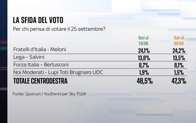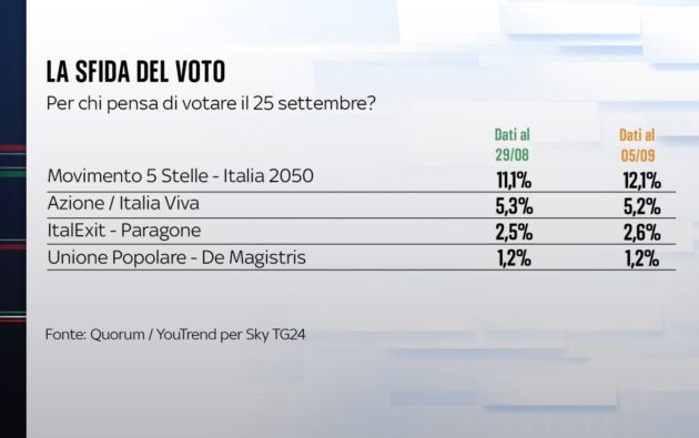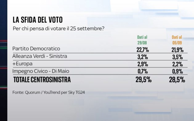 Secondo i dati di Quorum Fratelli d’Italia non dà segni di cedimento e resta la prima forza politica poco sopra al 24 per cento. A seguire c’è il Partito democratico, poco sotto il 22 per cento, che però nell’ultima settimana lascia sul campo lo 0,8 per cento (in parte recuperato dall’alleanza Sinistra-Verdi come vedremo). Al terzo posto, per Quorum, resiste al momento la Lega (13,5), che però è l’altro partito del gruppo di testa che rispetto al 29 agosto è in calo (dello 0,3). Ora il Carroccio rischia di essere incalzato dal M5s che in sette giorni sale di un punto netto e raggiunge quota 12. Sotto la linea del 10 per cento c’è Forza Italia che registra una brusca frenata (0,6) e viene stimata all’8,1. Gli azzurri restano comunque davanti al polo di Carlo Calenda e Matteo Renzi che continua a galleggiare un po’ sopra il 5 per cento.