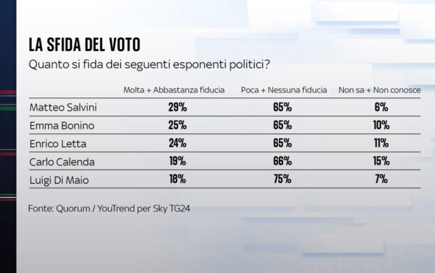 Un ultimo passaggio sul sondaggio Quorum/YouTrend riguarda la fiducia nei confronti dei leader politici. In testa restano il presidente della Repubblica Sergio Mattarella (61%) e il presidente del Consiglio Mario Draghi (54). La prima dirigente di partito è Giorgia Meloni con il 39 per cento di giudizi positivi, seguita da Giuseppe Conte che raccoglie il 34%. A seguire – a sorpresa, si potrebbe dire – c’è Silvio Berlusconi che batte sia Matteo Salvini sia Enrico Letta. Il segretario del Pd, tra l’altro, risulta superato anche da Emma Bonino.