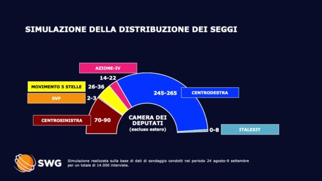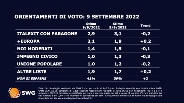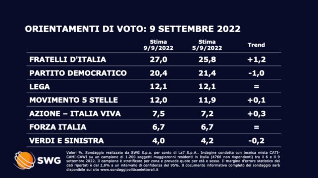 L'ultima rilevazione di Swg prima del voto segnala un'ulteriore crescita di Fratelli d'Italia. In calo invece il Partito democratico, mentre i 5 stelle raggiungono il Carroccio