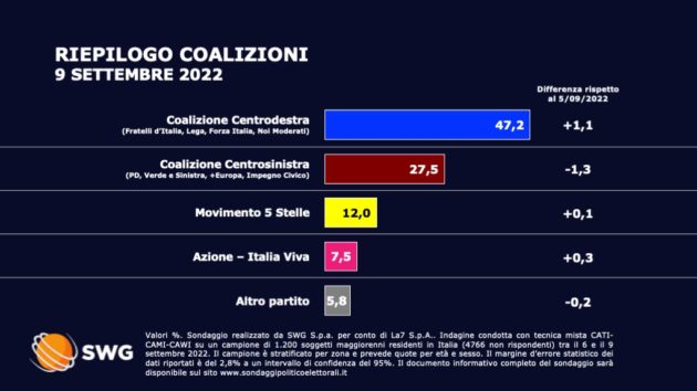 Fratelli d’Italia balza al 27%. A fotografare l’ulteriore crescita di consensi del partito di Giorgia Meloni è l’ultimo sondaggio SWG prima del 25 settembre, diffuso questa sera dal Tg La7. Secondo la rilevazione tra il centrodestra, dato al 47,2%, e il centrosinistra, stimato al 27,5%, ci sarebbe un distacco di quasi 20 punti.