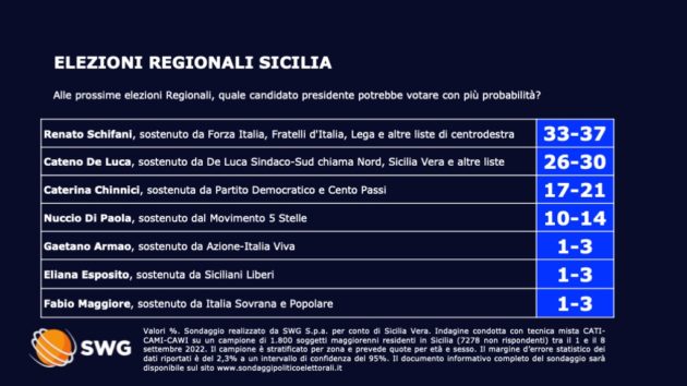 Swg ha anche testato i consensi per le prossime elezioni regionali in Sicilia. In vantaggio con una forchetta tra il 33 e 37 per cento c’è il candidato del centrodestra Renato Schifani. Ma subito dietro, a sorpresa, si piazza l’indipendente Cateno De Luca (26-30). Terza la democratica Caterina Chinnici (17-21) e quarto il M5s Nuccio Di Paola (10-14).