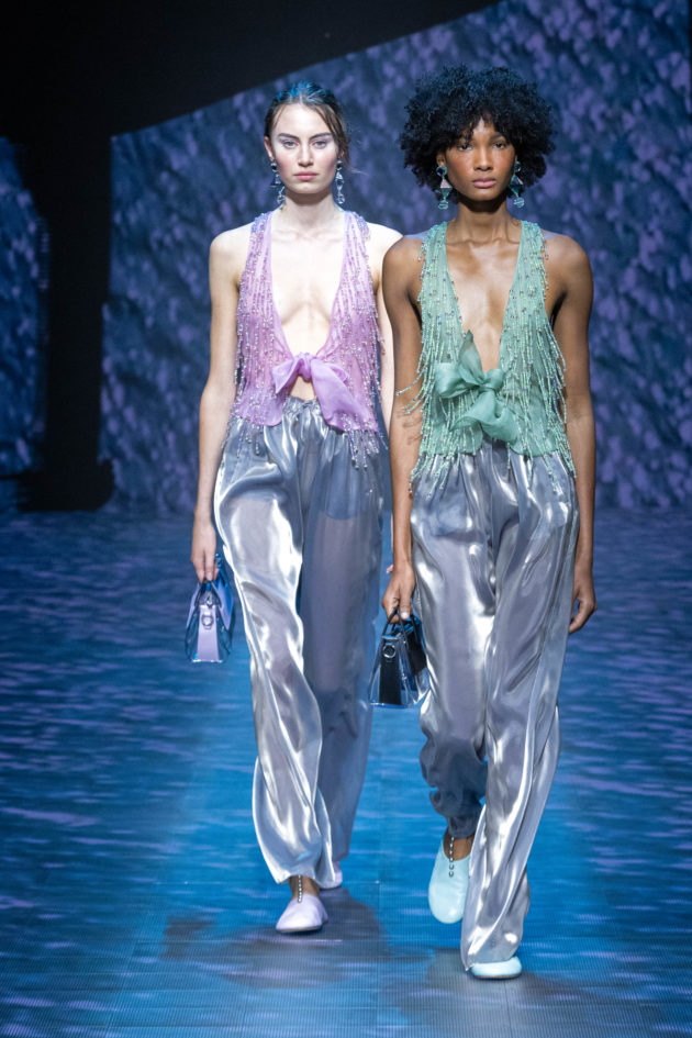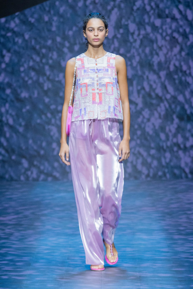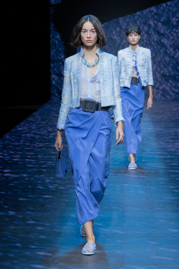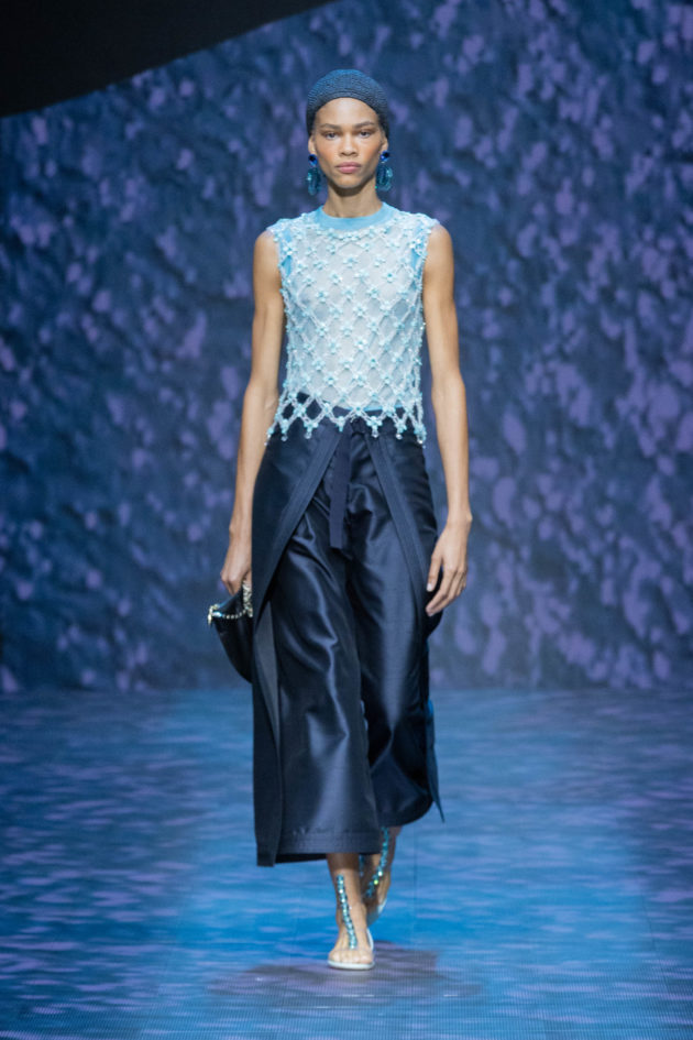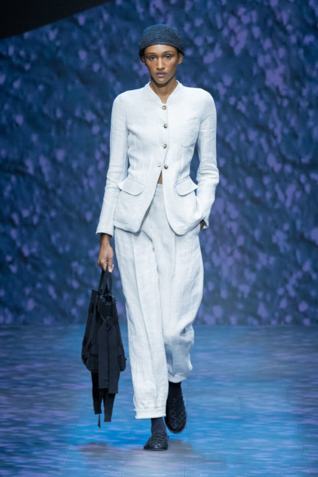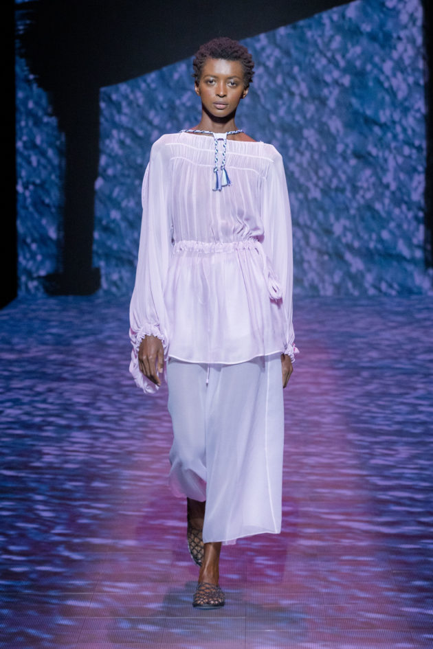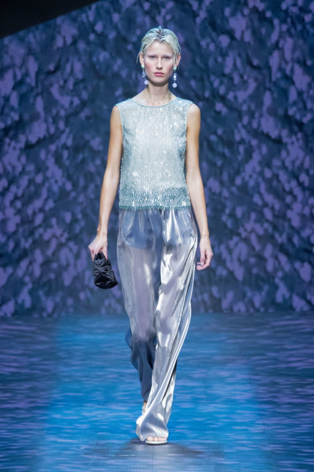 Ci sono le molteplici suggestioni del lontano Oriente mitico e mitologico tanto amato dallo stilista, ma non serve andar così lontano per godere del piacere di un viaggio. Questo è, infatti, prima di tutto uno stato mentale e in quanto tale vive nell’oggi, nel quotidiano. Ecco allora che “Re” Giorgio si lascia andare, per questa sua linea più giovane, al lusso dell’informalità più assoluta, decostruendo ogni giacca, ogni pantalone, ogni accessorio, per lasciare solo l’essenziale. Magnifiche sono le ciabattine in rete di paillettes, ma anche le pantofoline in pelle, che fanno come aleggiare le modelle a pelo d’acqua. I riflessi cangianti delle preziose sete dei pantaloni diventano così un tutt’uno con i bagliori emanati dalle onde, il tessuto è così sottile da essere quasi illusorio. Il bianco puro è il colore in assoluto predominante della collezione, simbolo per eccellenza dell’estate e di lontane terre assolate: arriva in città e trasforma l’asfalto in sabbia. L’unico grigio concesso, qui, è quello delicatissimo della sublime palette armaniana, declinato ora in un blaze e ora in una gonna di voile. E quando la luce si fa più calda, rosata, accarezzata dal tramonto, anche i colori si scaldano e s’infittiscono: arrivano i richiami floreali, l’acquamarina cristallina cede il passo ai verdi più intensi, il blu e il nero supremo. Profondo come il mare e luminoso come se baciato dai riflessi lunari. C’è grande attenzione ai tessuti, ai tagli, rigorosi e puliti, ai volumi, per un equilibrio formale essenziale a quell’ideale di eleganza che la donna amata da Giorgio Armani non può prescindere.