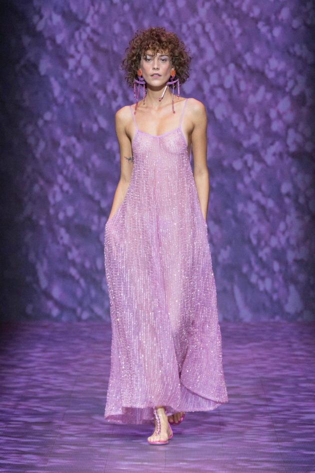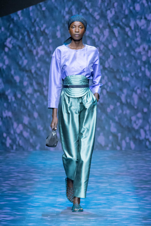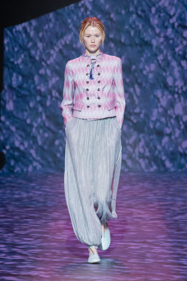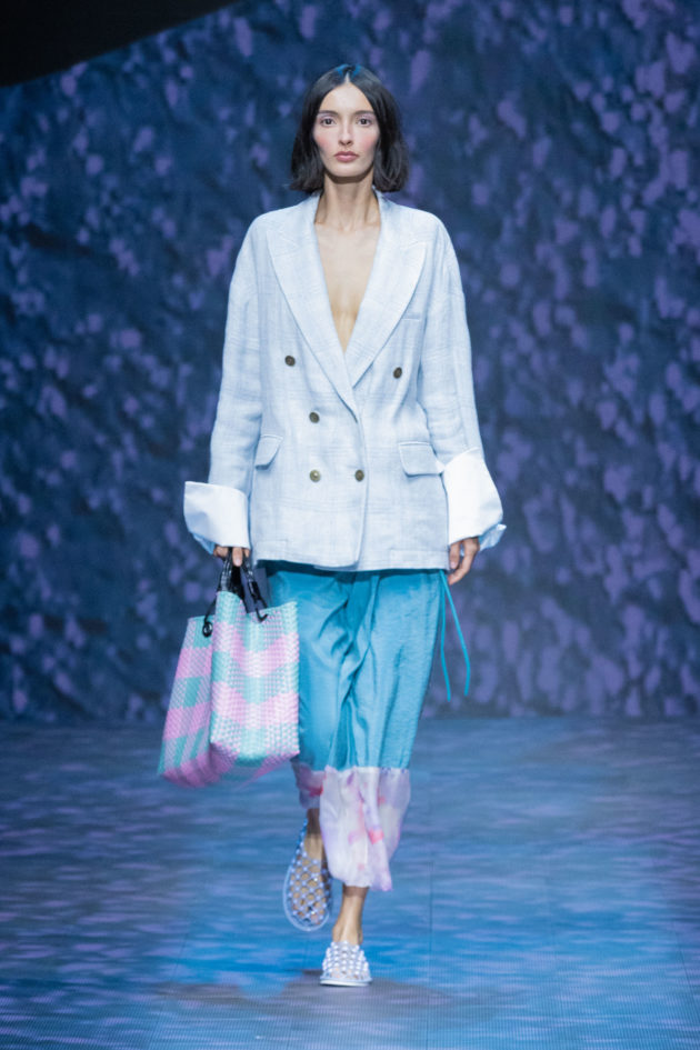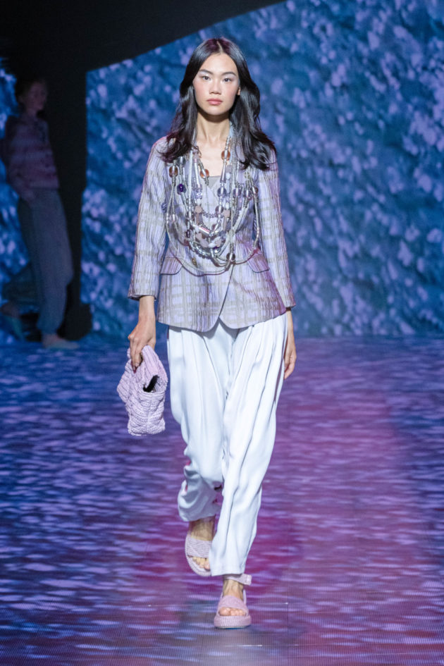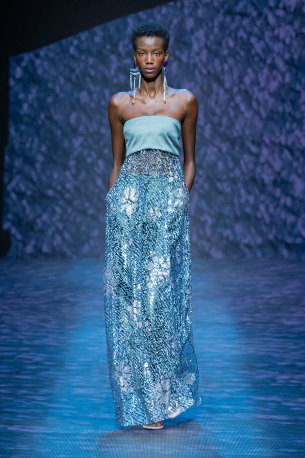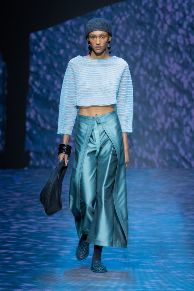 Ci sono le molteplici suggestioni del lontano Oriente mitico e mitologico tanto amato dallo stilista, ma non serve andar così lontano per godere del piacere di un viaggio. Questo è, infatti, prima di tutto uno stato mentale e in quanto tale vive nell’oggi, nel quotidiano. Ecco allora che “Re” Giorgio si lascia andare, per questa sua linea più giovane, al lusso dell’informalità più assoluta, decostruendo ogni giacca, ogni pantalone, ogni accessorio, per lasciare solo l’essenziale. Magnifiche sono le ciabattine in rete di paillettes, ma anche le pantofoline in pelle, che fanno come aleggiare le modelle a pelo d’acqua. I riflessi cangianti delle preziose sete dei pantaloni diventano così un tutt’uno con i bagliori emanati dalle onde, il tessuto è così sottile da essere quasi illusorio. Il bianco puro è il colore in assoluto predominante della collezione, simbolo per eccellenza dell’estate e di lontane terre assolate: arriva in città e trasforma l’asfalto in sabbia. L’unico grigio concesso, qui, è quello delicatissimo della sublime palette armaniana, declinato ora in un blaze e ora in una gonna di voile. E quando la luce si fa più calda, rosata, accarezzata dal tramonto, anche i colori si scaldano e s’infittiscono: arrivano i richiami floreali, l’acquamarina cristallina cede il passo ai verdi più intensi, il blu e il nero supremo. Profondo come il mare e luminoso come se baciato dai riflessi lunari. C’è grande attenzione ai tessuti, ai tagli, rigorosi e puliti, ai volumi, per un equilibrio formale essenziale a quell’ideale di eleganza che la donna amata da Giorgio Armani non può prescindere.