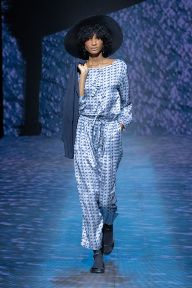 Il buio. Le note di un pianoforte che tintinnano veloci. Poi ecco comparire una lingua di mare blu, profondamente calmo all’orizzonte, quasi ci apparisse dopo aver attraversato l’ombra di una pineta. Un raggio di luce illumina le onde che si allungano lente e ipnotiche sulla passerella. Quindi, uno dopo l’altro, si susseguono bluse e blouson morbidamente candide, irridescenti pantaloni di seta, esotiche sahariane e fresche canotte in tessuto tecnico, evocative gonne a pareo e impalpabili abiti dai mille riflessi cristallini. Sarà perché fino a pochi giorni fa i raggi di un sole insolitamente tiepido ci cullavano negli ultimi scampoli d’estate, sarà perché il ricordo delle vacanze è ancora vivido nella mente. O forse, sarà perché perché nessuno come Giorgio Armani è in grado di far vivere un’emozione, una suggestione, attraverso i suoi abiti. Quel che è certo è che siamo usciti dall’ultima sfilata di Emporio Armani con addosso la stessa sensazione di nostalgica melanconia che si prova quando, alla fine di un viaggio, è tempo di fare i bagagli per tornare a casa. La stessa che ha catturato lo stilista, prendendo l’ispirazione per questa soave collezione Primavera/estate 2023, intrisa di ricordi di un viaggio, reale o immaginario che sia. Tanto che sembra messa insieme come di ritorno da un viaggio, pescando nella valigia oggetti raccolti e immediatamente amati per mescolarli con quel che si ha già, metafora calzante dello spirito eclettico con cui, ormai quarantun’anni fa nacque la linea Emporio. “È come portare la vacanza, in città”, ha spiegato Giorgio Armani al termine della sfilata tenutasi giovedì 22 settembre nel suo Armani Teatro. “Questa collezione esprime un pensiero di libertà e apertura: ho voluto portare nel vestire metropolitano, che è l’essenza di Emporio, la libertà e la leggerezza del ritorno da un lungo viaggio nel quale si sono accumulate cose e ricordi, e li si mescola nella propria quotidianità”.