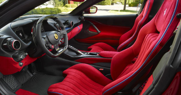 Anche il colore è su misura: si chiama “Rosso Passionale” ed è una nuova tinta triplo strato, sviluppata appositamente per questa vettura ed esaltata dalla livrea longitudinale bianca e blu, a sua volta “ispirata a una leggendaria Ferrari 410 S del 1955 ma che, in questa interpretazione, attraversa la vettura fino a penetrarvi all’interno”, spiegano dalla Ferrari. Specifici pure i gruppi ottici anteriore ed i cerchi, dotati di alette in fibra di carbonio su tutte le razze.
