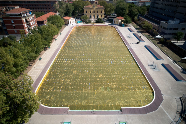 La prima opera creata per la mostra a Milano è un carretto realizzato con una vecchia tanica per l’acqua che inscatola sorrisi. Ma non è facile sorridere dopo un’installazione immersiva come quella nello spogliatoio che, a prescindere dai significati connessi all’attualità, è un’esperienza totalizzante sulla caducità della vita e l’obsolescenza dei ricordi. Proseguendo attraversati i tornelli, in cui solitamente è obbligatorio lavarsi i piedi prima di entrare in acqua, si giunge alla piscina, trasformata in un’immensa distesa dorata da migliaia di coperte termiche. “Emergence Pool” (2022) può suscitare immagini legate all’immigrazione, tanto quanto alla conclusione di competizioni sportive come le maratone. Le coperte termiche utilizzate per gli immigrati e per gli atleti sono le stesse che ricoprono la grande piscina all’aperto. “Gilded Darkness”, il titolo della mostra, rimanda a un’oscurità dorata. Ma l’oscurità sembra dissolversi alla fine del percorso, in cui una composizione di bandiere bianche tenute da una gru ricorda quasi un enorme canestro in cui segnare.