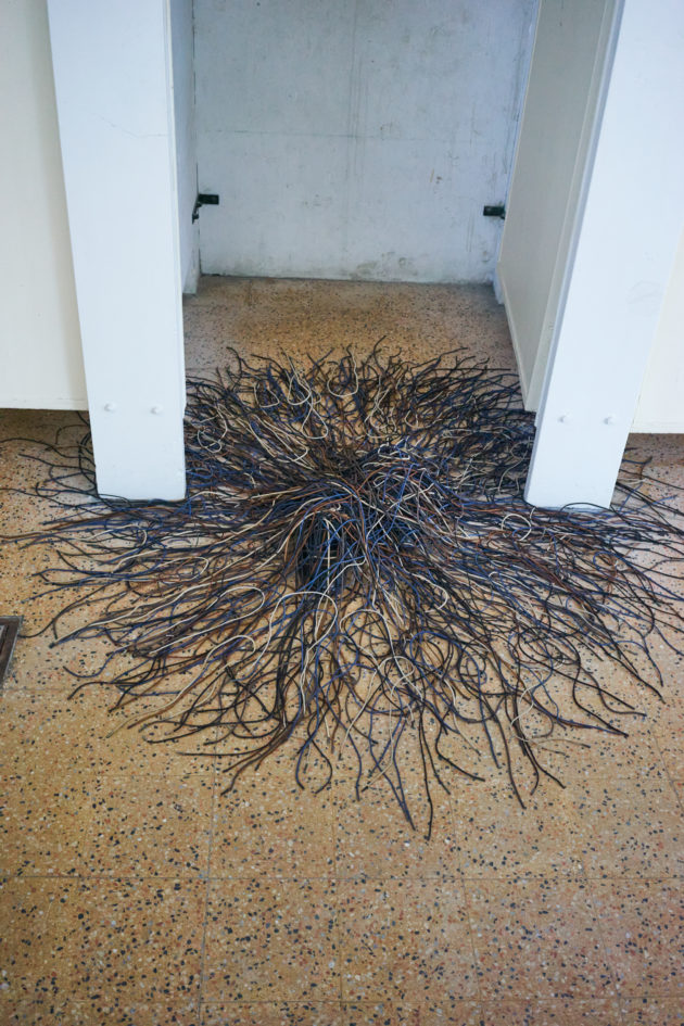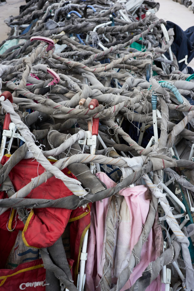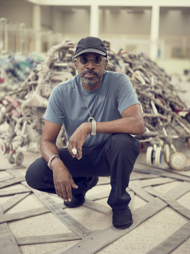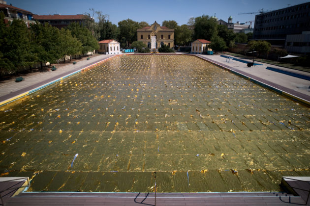 La personale di Nari Ward organizzata dalla Fondazione Trussardi al Centro Balneare Romano è un percorso in cui gli oggetti comuni diventano simboli, all’occorrenza, di narrazioni socio-politiche diverse. In “Gilded Darkness”, opere storiche e site-specific dell’artista statunitense di origini giamaicane si fondono con l’architettura fascista della piscina, inaugurata nel 1929 dall’allora podestà di Milano. All’ingresso, l’installazione “Amazing Grace”, composta da oltre 300 passeggini abbandonati legati insieme negli spogliatoi, sembra ricordare le morti dei rifugiati nel Mediterraneo. Quando è stata creata, nel 1993, l’installazione era invece stata associata alle morti connesse all’epidemia di AIDS.