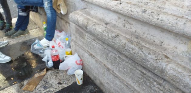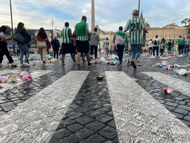 Rifiuti, sporcizia ovunque e anche uomini che hanno usato le colonne come orinatoio. È quello che hanno lasciato i tifosi spagnoli del Betis Siviglia in piazza del Popolo a Roma. Cittadini di Roma e i turisti hanno assistito a scene che in molti casi sono fotografate e filmate. I circa 5mila tifosi del Betis (che in serata affronta la Roma all’Olimpico per l’Europa League) sono arrivati questo pomeriggio nel centro della Capitale e hanno mangiato e in alcuni casi orinato per strada. Dopo il passaggio dei vandali è stato richiesto l’immediato intervento dell’Ama che ha ripulito tutto. Ripristinato il consueto stato della piazza, non si sono registrati incidenti.