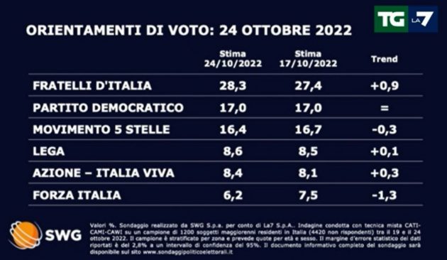 L’effetto trascinamento funziona ancora un mese dopo le elezioni politiche. La vittoria di Fratelli d’Italia e di Giorgia Meloni diventa un trionfo nel sondaggio settimanale di Swg per il TgLa7 che cade nella settimana della formazione e del giuramento del nuovo governo. Secondo l’istituto triestino Fdi sfonda anche quota 28 per cento, con un balzo di quasi un punto nell’ultima settimana. A inseguire sono Pd e M5s, separati da qualche decimale: i democratici si confermano al 17 per cento, mentre i 5 Stelle arretrano leggermente al 16,4. Sembra stabile la situazione della Lega all’8,6, mentre guadagna qualcosa il polo centrista Azione-Italia Viva (8,4, +0,3). A registrare la flessione più significativa è invece Forza Italia: nei giorni delle performance e del protagonismo di Silvio Berlusconi il partito ne risente (come può succedere a chi mina l’unità di uno schieramento specie se vincente), gli azzurri scendono dal 7,5 al 6,2. Più o meno stabili gli altri partiti rappresentati in Parlamento (l’alleanza Sinistra-Verdi è ferma al 4,1 e +Europa al 3,1 in lieve calo), così come le forze politiche rimaste fuori come Italexit e Unione Popolare.