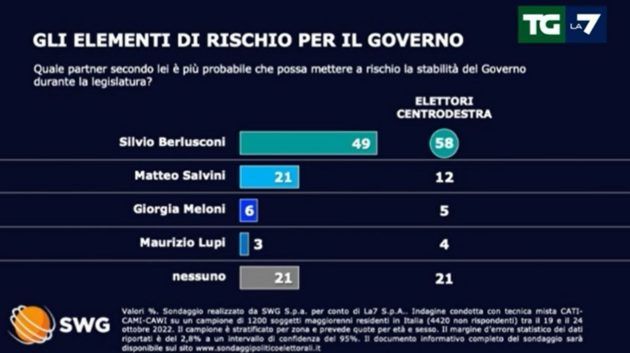 Infine Swg ha domandato al campione di intervistati quale può essere l’elemento di instabilità del governo appena nato. Prevedibilmente la risposta più gettonata è caduta su Silvio Berlusconi (49 per cento tra tutti gli intervistati, che sale al 58 tra gli elettori del centrodestra), anche se uno su 5 ha citato anche Matteo Salvini.