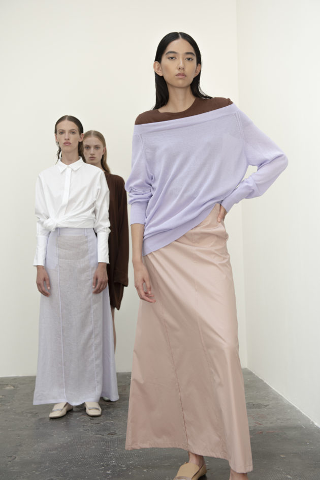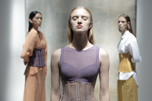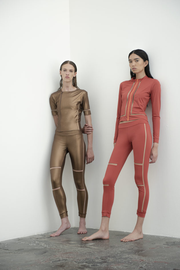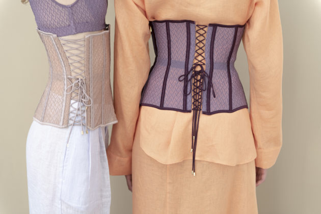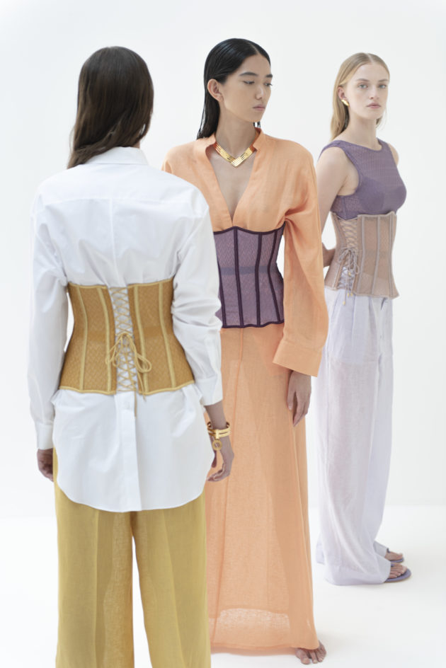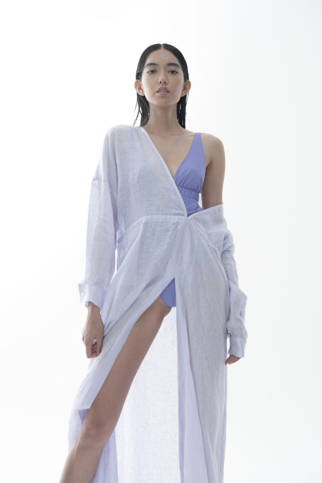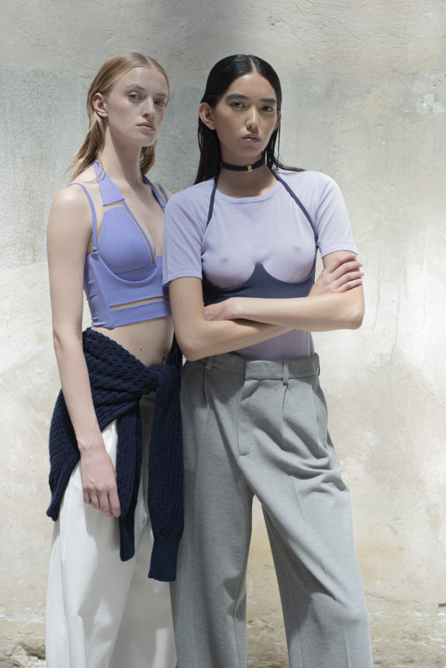 “Tutta la nostra filiera è italiana: dai tessuti alle componenti fino al taglio. Questo ci garantisce un’altissima qualità a cui abbiniamo la nostra creatività. Abbiamo creato una linea di capi ‘fuori acqua’, cioè camicie, pantaloni, maglie e abiti trasversali, perfetti per una donna sempre in movimento che ha bisogno di pochi capi multifunzione nel bagaglio a mano”. Come il costume Keros: è, appunto, un costume, ma è perfetto anche come body e sottogiacca. Ma il vero centro resta il tulle: “Il tulle di Exilia è ciò da cui tutto ha avuto inizio. Il mio amore per questo marchio è legato proprio a questo tessuto morbido, avvolgente e impalpabile, che rende la lingerie una vera seconda pelle. È fatto ancora a telaio e io ho voluto rendergli omaggio inserendolo anche in tanti altri capi, a fare da fil rouge: nei costumi per definire la silhouette, nei leggings sportivi per dargli quel tocco chic, ma soprattutto nei corsetti, vero accessorio di stile da portare sopra a maglie e camicie, non sotto”. L’idea è quella di partire dalla lingerie per costruire un vero e proprio guardaroba funzionale, pochi pezzi versatili e adattabili a seconda dell’occasione, come la camicia bianca che indossa Giada. All’insegna di una femminilità sensuale ma non sfacciata, di una bellezza elegante e sofisticata che piace alle giovani ma anche alle signore più grandi. “Mettiamo grande attenzione in ogni dettaglio: le etichette sono cucite a mano così se ti danno fastidio le puoi togliere senza distruggere le mutande. Tutto è fatto in Italia, lavorato in pulizia, cioè con il dritto uguale al rovescio, materiali e tinture impeccabili. Anche gli elastici sono frutto di una ricerca dell’eccellenza”.