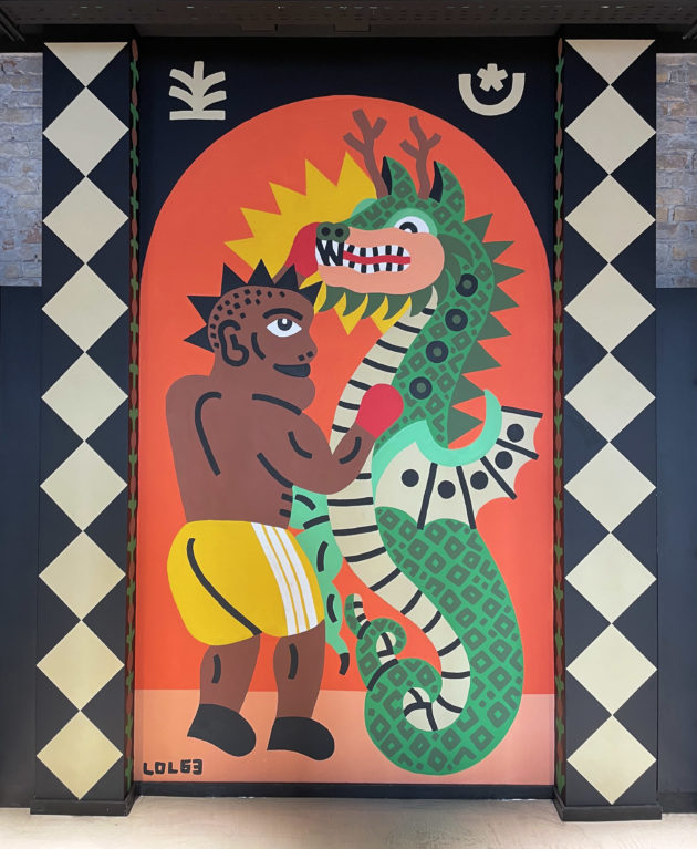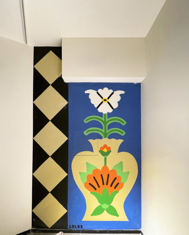 Per esempio, gli artwork di Peeta giocano con le linee semplici dell’architettura razionalista del palazzo, creando illusioni ottiche basate sulla prospettiva e sulla tridimensionalità. Le lastre di marmo dei banconi acquistano profondità con l’optical art di Sorte e oltre i pavimenti in legno prendono vita i labirinti impossibili e geometrici di Joys. C’è poi il simbolismo di Ozmo, che reinterpreta l’iconografia rinascimentale della montagna sacra con l’innesto di linguaggi esoterici, dai draghi alle raffigurazioni lunari dei tarocchi. Ma anche figure che sembrano uscite dai dipinti di Hieronymus Bosch che convivono con il dinamismo dei supereroi contemporanei della Marvel, creando così un mondo misterioso e affascinante nel suo irrealismo.