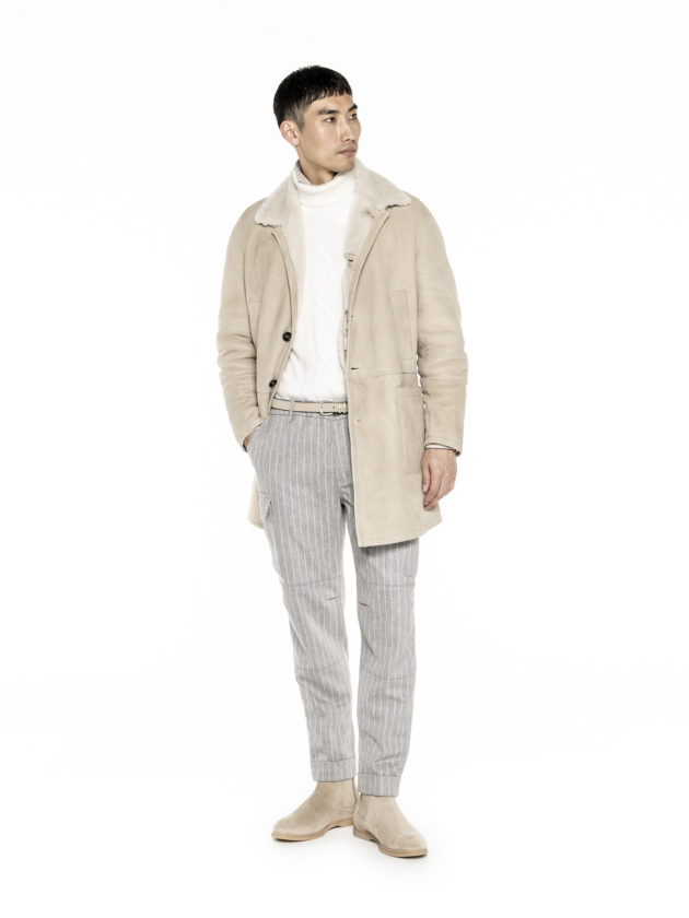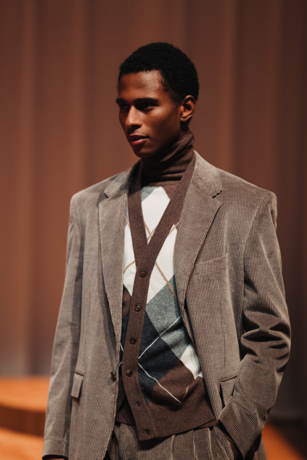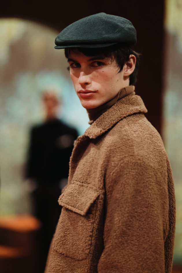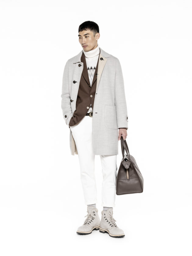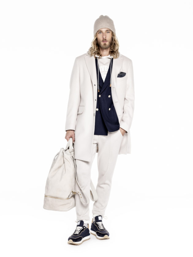 È stato decisamente più facilitato nel compito, invece, Alessandro Sartori, il direttore creativo di Zegna, storico lanificio biellese. L’azienda, con alle spalle una solida tradizione familiare, ha puntato tutto sull’altissima qualità delle sue materie prime mettendo al centro la filiera produttiva non solo metaforicamente. In una storica manifattura di Lambrate, ha ricostruito la sala delle mischie, dove si lavora il cachemire che poi andrà a comporre il 70% dei capi della sua prossima collezione Autunno/Inverno “Oasi di cachemire”. Quei batuffoli bianchi che volteggiano in aria nelle grandi vasche di vetro sono infatti gli stessi che vengono selezionali dagli artigiani del gruppo e poi trasformati prima in filato, poi in materia e infine in prodotto. Con Oasi Cachemire, Zegna si è posta l’obiettivo di diventare completamente tracciabile con la fibra del cachemire entro il 2024. Il brand ha sviluppato questo nuovo tessuto di cachemire con cui va a comporre capi disegnati secondo un tailoring moderno che si combinano tra loro in un perfetto incastro di silhouette e proporzioni. L’estetica è pulita ed essenziale, i grigi mélange medi e scuri si accompagnano ai toni cammello con tocchi di colore a spezzare la monocromia. La grammatica che compone questo guardaroba maschile è quella tipica del brand, con la comodità di capi senza costruzione definiti solo attraverso il taglio e tessuti ricercati dal touch avvolgente e funzionale. L’attenzione per la sostenibilità unita a quella per la tradizione, ha fatto recuperare infatti a sartori l’antico casentino, un particolare tessuto di lana pratico per la sua impermeabilità e accattivante per il suo finishinig “a pallini”. Focus sui materiali anche nella nuova collezione A/I 2023 di Eleventy, brand nato dalla precisa intuizione di Andrea Scuderi, Paolo Zuntini e Marco Baldassari di puntare tutto sullo smart luxury, ovvero su capi sartoriali e giovanili all’insegna di un’eleganza informale. L’ispirazione è a quel mood preppy anni ’60, per un uomo tutto “perbenino”, curato nei minimi dettagli. Tra le novità della stagione il “bianco nuvola” e una rivisitazione del blazer, capo iconico di Eleventy, in chiave più chic, che osa un ritorno a spalline più piccole: si accompagna ai pantaloni di velluto a costine o al denim. Menzione speciale, poi, per i capi reversibili, in primis gli imbottiti: capolavori sartoriali che richiedono fino a 18 ore di lavoro artigianale per ogni singolo pezzo, perfetti per garantire diversi look durante un viaggio con poche combinazioni a disposizione.