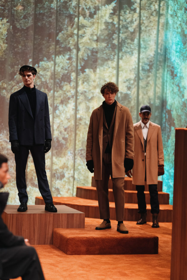 Casual è la parola d’ordine anche della nuova collezione di Canali, l’azienda di sartoria fondata nel 1934 in un piccolo paesino della Brianza da Giacomo e Giovanni Canali. Oggi il marchio è guidato da Stefano Canali, terza generazione della famiglia, che lo sta proiettando sempre di più nel mercato internazionale: dopo aver chiuso il 2022 con un fatturato di oltre 193 milioni, si appresta ora ad inaugurare nei prossimi mesi altre quattro nuove boutique, una a Milano, due in Cina e poi in India. D’altra parte, proprio i Paesi esteri rappresentano il 90% del mercato del brand, con Stati Uniti e Regno Unito in primis. “Adesso lavoriamo per dare alle nostre collezioni una componente sempre maggiore di sostenibilità, non solo a livello ambientale con il tracciamento della filiera Made in Italy, l’utilizzo di materiali riciclati e il monitoraggio dell’impatto dell’organizzazione produttiva, ma anche sociale, con un’attenzione verso i nostri dipendenti”, ci spiega Stefano Canali, Ceo dell’azienda, durante la presentazione nello spazio scenografico del Salone dei Tessuti, palazzina in stile neogotico originariamente destinata allo stoccaggio e controllo di qualità e metraggi dei tessuti. La sostenibilità, per Canali, è la massima espressione di gentilezza: una forma di rispetto per l’ambiente e per l’intera comunità umana: “Migliorare si può e si deve, ma serve prima di tutto maturare consapevolezza relativa al proprio operato. Occorre misurarsi. Da qui la decisione di quantificare l’impronta complessiva del nostro business sviluppando gli studi OEF (Organisation Environmental Footprint) e PEF (Product Environmental Footprint). Sono misurazioni oggettive, scientifiche, chiare, lontano da ogni logica di greenwashing, quantificano 16 indicatori in diversi ambiti, dal cambiamento climatico al consumo di acqua e risorse naturali, dagli eco-sistemi alla salute dell’uomo, analizzando in profondità l’impronta ambientale di tutta la filiera, a monte e a valle del prodotto e dell’azienda. Ciò che è emerso è che un capo Canali ha benchmark di durabilità superiori alla media di settore mentre il suo impatto, considerato l’intero ciclo di vita del capo, è nettamente inferiore”. Questo approccio responsabile, da sempre valore intrinseco nel Dna del brand, trova ulteriore esemplificazione nei capi Care qui presentati, dove proprio i tessuti hanno un ruolo centrale in questa collezione che si ispira nei toni ai colori della natura, dai verdi ai beige e i marroni: materiali organici certificati o riciclati di altissima qualità, dove anche l’imbottitura dei capi trapuntati è realizzata con gli scarti dei tessuti del ciclo produttivo in un primo esperimento di upcycling. Con la collezione Uomo Autunno-Inverno 2023/24, anche Santoni elabora i propri codici distintivi attraverso materiali innovativi. Anche la più classica delle calzature maschili si anima con un guizzo di personalità grazie ai colori degradè, emblematici del brand così come bla doppia fibbia, ora applicata anche alle borse maschili. Tutto nel segno di un’artigianalità evoluta che connota l’universo maschile con una purezza di stile e l’unicità del prodotto.