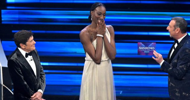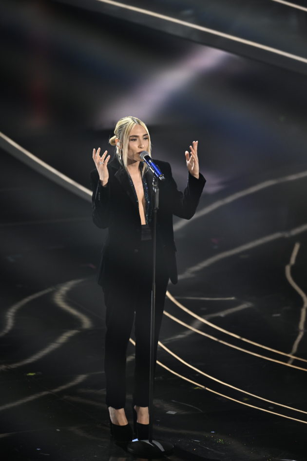 Paola Egonu: 9 – La forza della semplicità. Per il debutto all’Ariston ha scelto un impalpabile abito monospalla Giorgio Armani di un caldo bianco panna, con un’essenziale cintura a cordone a segnare il punto vita. Scende la scalinata e sembra una dea greca che discende dall’Olimpo. Alle 23.15 arriva il primo cambio di look: scende le scale con un completo Emporio Armani di paillettes nere, la giacca volutamente scollata con il punto vita evidenziato da una cinta. Una preziosa collana d’oro riempie la scollatura, i capelli sciolti con naturalezza e niente tacchi: adesso si cha Paola è decisamente più rilassata sul palco dell’Ariston.
