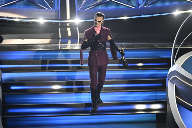 Rosa Chemical: 8 – È padrone del palco come pochi, si gode il momento e si gusta i riflettori puntati: questo gli dà una disinvoltura impagabile. Metteteci poi un bel completo borgogna di Moschino by Jeremy Scott con maniche a cappa e dettagli in vinile a contrasto e il gioco è fatto.