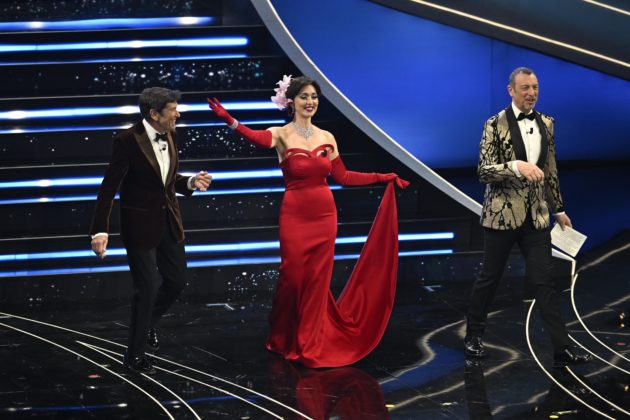 Chiara Francini: 8,5 – Il cuore rosso è il leit motiv dei suoi look qui a Sanremo: prima in conferenza stampa e ora sul palco dell’Ariston. L’attrice indossa Moschino by Jeremy Scott e mai scelta fu più azzeccata: lo stile giocoso e irriverente del brand rispecchia perfettamente la sua comicità e le offre l’assist perfetto per alcune battute. Il primo ingresso è con un completo pantalone nero con maxi cappa in velluto nero chiusa proprio da un cuore rosso. Lo stesso che ritroviamo anche sulle scarpe e sulla borsetta. La stessa che tiene tra le mani anche con il secondo look: da vera diva, è un sofisticato abito a sirena di velluto blu notte con maxi maniche “a prosciutto” e una corona di fiori tra i capelli. Bellissimo e completato dalla preziosa parure di brillanti e zaffiri. Il terzo look è un abito a sirena rosso con strascico alla Jessica Rabbit: l’allure retrò le dona e ha quella spigliatezza tale da sdrammatizzare anche un vestito impegnativo come questo abbinato a gioielli altrettanto importante.