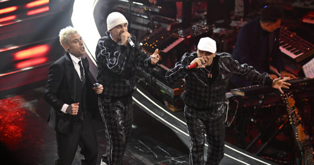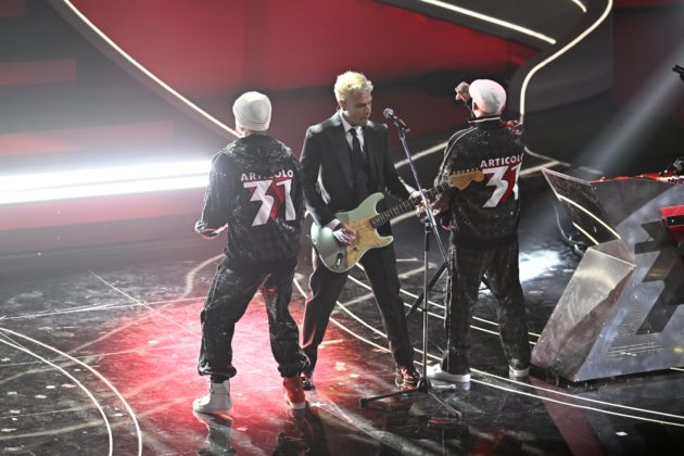 Articolo 31 e Fedez: 7,5 – Per quanto un completo di Prada strida alquanto con canzoni come “Maria” e “Tranky funky”, non si può negare che sia impeccabile. Tute glitterate coordinate invece per J Ax e Dj Jad.