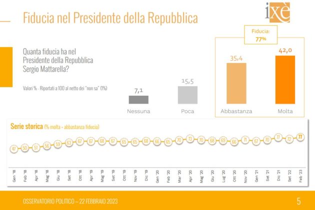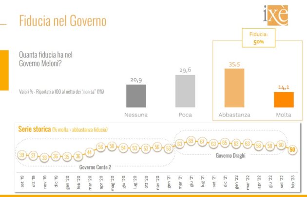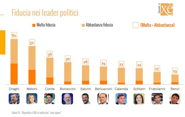 Il fatto che Fratelli d’Italia sia il fattore trainante di gradimento per l’intero esecutivo è confermato da un altro indicatore, quello della fiducia nei leader. La premier Meloni è in testa nella graduatoria dei capi partito con una percentuale molto alta, sopra al 50 per cento. Sopra di lei ci sono solo il suo predecessore Mario Draghi (60) e il presidente della Repubblica Sergio Mattarella (77), che peraltro sono figure più istituzionali (e meno divisive). Il primo inseguitore di Meloni, invece, è un altro ex presidente del Consiglio, il leader del M5s Giuseppe Conte (distaccato comunque di una quindicina di punti, al 36). La new entry è Stefano Bonaccini, presidente dell’Emilia Romagna e candidato alla segreteria del Pd, che si attesta al 30 per cento e supera il ministro e segretario della Lega Matteo Salvini. Sembra in risalita Silvio Berlusconi: il presidente di Forza Italia sopravanza il leader di Azione Carlo Calenda, appaiato al 22 con l’altra candidata alla guida del Pd, la deputata Elly Schlein. A chiudere questa classifica è, come per sua abitudine, il leader di Italia Viva Matteo Renzi, preceduto anche dal segretario di Sinistra Italia Nicola Fratoianni.