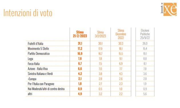 Infine i dati dei partiti. Emerge che Fratelli d’Italia guadagna un altro punto in sole 3 settimane, dal 30,1 al 31,1 per cento. Si allarga la forbice del distacco dal primo che segue, cioè il M5s che scende al 17,2 (-0,7). Poco lontano il Pd, in leggera ripresa, forse sull’onda della spinta delle primarie in corso: ora è al 16,9, con un incremento dello 0,2 rispetto al dato precedente del 3 febbraio. Tutte le altre forze politiche sono sotto l’8 per cento: la Lega al 7,6 (in calo), Forza Italia (6,7, ha perso quasi un punto in meno di 20 giorni), il polo centrista Azione-Italia Viva (anche questo in flessione), Alleanza Sinistra-Verdi (unica dei “piccoli” in aumento).