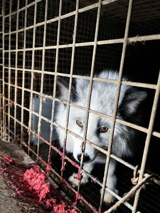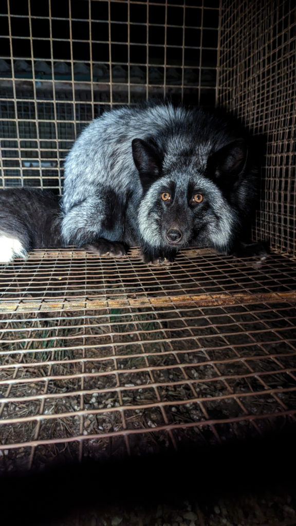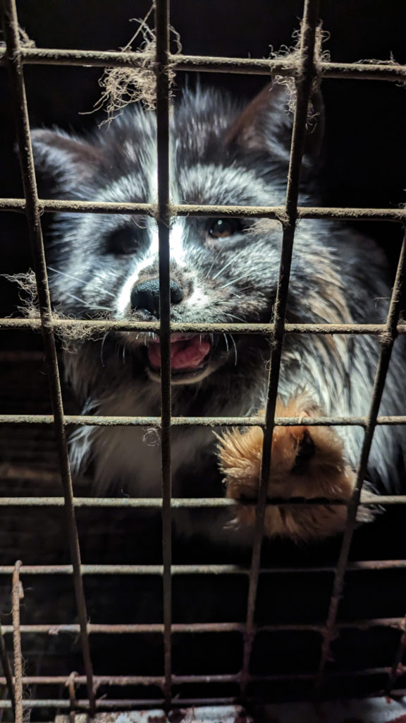 Abbiamo visto lunghe file di gabbie singole, al cui interno, a causa delle condizioni in cattività, le volpi giravano compulsivamente in cerchio, sbattendo contro le pareti in metallo. Le gabbie a batteria erano sporche e spoglie. Come nel caso dei visoni, il pavimento delle gabbie era in metallo, un fattore che causa forte dolore alle zampe degli animali. Abbiamo poi visto una volpe con le gengive molto gonfie, una condizione dovuta alla gengivite iperplastica ereditaria, una malattia genetica che colpisce le volpi selezionate per la produzione di pellicce.