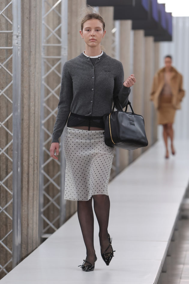 La borsetta matelassé portata nell’incavo del braccio, il mazzo di chiavi tenuto in mano e gli occhiali da sole scuri. E poi il tacchetto e il cappottino con il blazer e la maglia di cachemire che lasciano scoperte le lunghe gambe affusolate. Come se fosse appena uscita di casa con il passo svelto e la testa già rivolta altrove. La donna Miu Miu è una sofisticata intellettuale un po’ birichina. La collegiale che “rubava” i vestiti dall’armadio della mamma è cresciuta ed è ora una donna in carriera che gioca consapevolmente con la propria femminilità. È la zia single che cattura l’attenzione ai pranzi di famiglia e fa invidia con la sua libertà. Dopo il successo delle microgonne e dei completini “sforbiciati” delle scorse stagioni, Miuccia Prada porta questa volta in passerella l’equilibrio perfetto tra pensiero e vanità, una riflessione sulla potenza dell’osservazione che ci porta a carpire pulsioni ed ossessioni che altro non sono se non il riflesso di ciò che già è nascosto in noi. Lo fa con la nuova collezione Autunno/Inverno 2023-24 di Miu Miu “Ways of looking” già cult e oggetto di desiderio.