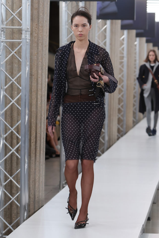 L’incastro di vedo e non vedo apre un affaccio sul mondo creativo di Miuccia Prada, rivela nuovi scorci d’osservazione e di interpretazione del corpo. Nell’aria c’è un certo languore, enfatizzato anche dalle note sensuali dei sassofoni di Frédéric Sanchez: in passerella, le modelle ancheggiano con naturalezza sulle nuove slingback nere con laccetti, già un must. A chiudere la sfilata ci ha pensato Emma Corrin, la Lady Diana della serie Netflix: il suo look, con la mutanda-gioiello dorata, il collant nero velato e il maglioncino bon ton beige è già iconico. D’altra parte, non dimentichiamo che Miu Miu è stato il brand più desiderato del 2022 secondo il Lyst Index.