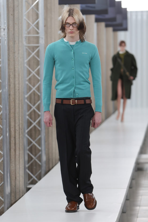 “L’idea al centro di questa collezione era guardare alla moda da un punto di vista personale“, spiega la stilista ai margini della sfilata che si è tenuta martedì 7 marzo al Palais d’Jena, la sede parigina del Consiglio economico, sociale e ambientale ormai luogo d’elezione per il brand giovane di casa Prada, mentre la capitale francese era paralizzata dagli scioperi e dalle manifestazioni messi in atto contro la riforma delle pensioni varata dal governo. Un concetto, quello del punto di vista personale, amplificato anche dalle passerelle sopraelevate e dai maxi schermi opera dell’artista sudcoreana Geumhyung Jeong, che ha ridefinito con questa installazione lo spazio architettonico anni ’30 creando una geometria di sguardi che cattura i dettagli. “Mi interessa sempre molto il modo in cui le persone vedono le cose, la loro considerazione. Il motivo per cui alcuni sono attratti da certe idee, mentre altri le rifiutano. Questa collezione esplora l’idea del guardare, il concetto che – attraverso uno studio attento – i capi possono essere trasformati sia nel modello che nel modo in cui vengono indossati. Come la moda e il disegno possano cambiare le percezioni, anche di cose che pensiamo di conoscere. È un invito a riconsiderare”.