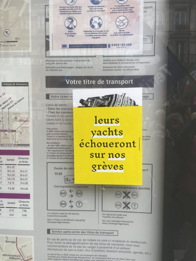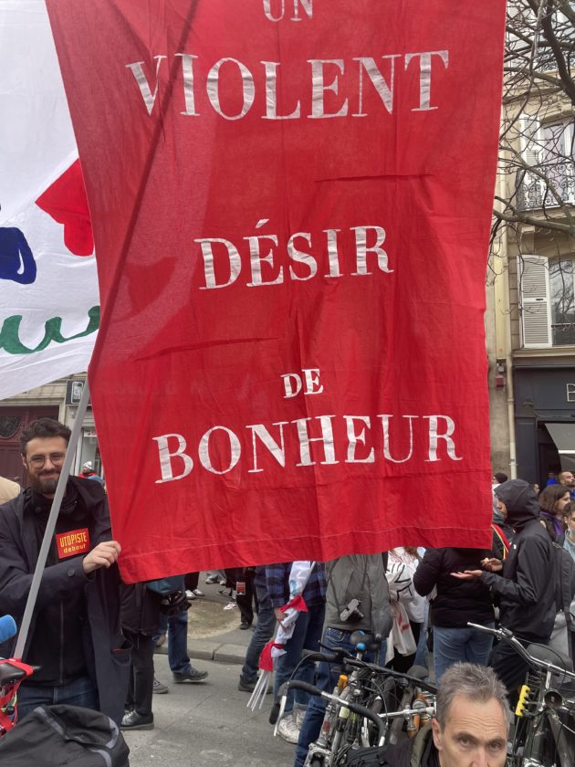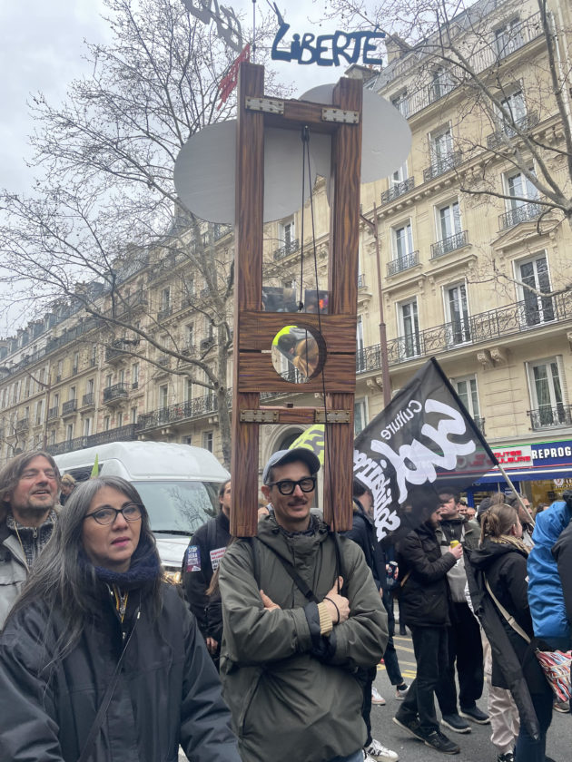 Gli slogan – Come una protesta si racconta può essere quasi più importante della protesta stessa. I cartelli, gli striscioni e gli slogan dicono molto di quello che la piazza sta chiedendo e della potenza che sta mettendo nel comunicarlo. E protestare al tempo dei social network e dei contenuti che possono diventare virali, rende l’aspetto simbolico ancora più necessario. È sui muri di Parigi che si trovano le tracce dei messaggi più duri nei confronti del potere: “Macron vattene, il tuo mondo non lo vogliamo”, è uno dei più delicati. Poi: “Fuck Macron”, “Il popolo vuole la caduta del regime”, “Macron ti odiano tutti”, “Morte al Re”, “Rivoluzione evoluzione”. Il confronto tra Macron e il Re Sole è uno dei più citati: il capo dello Stato è paragonato al monarca assoluto che diceva “Lo Stato sono io”. E poi, naturalmente, si rievoca la Rivoluzione francese: “Luigi XVIesimo l’abbiamo decapitato, Macron possiamo ricominciare”, è uno dei cori preferiti dagli studenti. E nei cortei c’è chi ha portato una vera ghigliottina in cartapesta. I cartelli poi, si dividono quasi equamente nella denuncia del lavoro come sfruttamento e dell’allarme per l’emergenza climatica. E, soprattutto, si stravolge il concetto di utopia: utopico non è chiedere di cambiare tutto, ma pretendere di andare avanti con il sistema attuale. “Utopisti in piedi”, è uno degli adesivi, rigorosamente di colore rosso, più distribuiti. Il secondo è “Vogliamo del tempo per vivere”, slogan su uno sfondo verde con un sole che sorge. “Vivere o lavorare. Bisogna scegliere”, è la scritta fatta con lo spray nero sulle mura di Boulevard Voltaire. Mentre è stata avvistata più volte una bandiera rossa montata su uno stendardo che recita: “Un violento desiderio di felicità”. Tutto quello che il sistema capitalista ha messo in secondo piano (la felicità, la salute mentale, il tempo libero), diventa nelle piazze francesi prioritario e il punto di ri-partenza. Scrivono: “Le nostre vite valgono di più dei vostri profitti”, “Aumentare i salari non l’età della pensione”, “I loro yacht andranno a picco con i nostri scioperi”, “Abbasso il lavoro”. “(G)rêve encore” è il gioco di parole usato più spesso dagli studenti: la parola sciopero (grève) viene fatta incastrare con sogno (rêve) e il risultato è un doppio messaggio: sogna ancora, ma anche sciopera ancora. Altrettanto importanti sono poi, i messaggi sull’emergenza climatica: “Per i nostri genitori sfruttati e i nostri futuri sabotati”, “Più 2 anni, i vecchi al lavoro. Più 2 gradi, i giovani sotto l’acqua”, “Il pianeta brucia”, “Macron deve tassare chi inquina”. E non ci sono solo le parole: ha fatto il giro del mondo il balletto della techno-ecologista Mathilde Caillard che si muove scandendo un ritornello che fa semplicemente “Taxez les riches”. Ovvero “tassate i ricchi”. Molto presenti anche le rivendicazioni femministe. Il collegamento l’hanno fatto in pochi, ma le decine di adesivi con lo slogan “No vuol dire no”, non rievocano solo le barricate, ma prendono in prestito le stesse parole usate nelle battaglie per il consenso e la violenza contro le donne.
