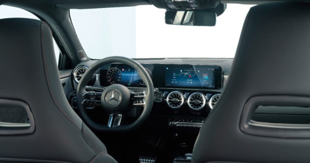 Il suo presente, invece, passa dall’aggiornamento di metà carriera del modello attualmente a listino. Ecco quindi che arrivano un musetto ancora più affilato, da squalo, un cofano con due muscolose nervature, la griglia frontale “a stellette” e gruppi ottici aggiornati nella grafica. Un maquillage leggero, perché squadra che vince non si cambia, o perlomeno si cambia poco. La continuità si ritrova pure all’interno, dove il sistema di infotainment MBUX a controllo vocale si aggiorna – strumentazione e infotelematica si controllano da due schermi con diagonale fino 10,25”, che campeggiano all’apice della plancia – e arriva una console centrale ridisegnata.
