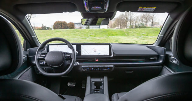 Poi ci sono due taglie di batteria – 53,3 o 77,4 kWh – che tollerano una potenza massima di ricarica è di 11 kW in corrente alternata e di 350 kW in corrente continua, grazie all’architettura da 800 Volt. Con una colonnina da 350 kW del consorzio Ionity, di cui Hyundai fa parte, si recuperano 351 km di autonomia in 15 minuti e si può sfruttare la funzione Plug&Charge: dopo aver collegato l’auto alla presa, la ricarica parte in automatico senza usare alcuna app. Le combinazioni tra powertrain e accumulatori determinano tre livelli di potenza – 151, 228 e 351 CV – e altrettanti di autonomia, che corrisponde a 429, 614 e 583 km. Considerate le dimensioni delle batterie le percorrenze sono ottime e dipendono dal mix tra l’efficienza dei propulsori e l’aerodinamica raffinata, che portano a un consumo medio WLTP compreso tra i 14 e i 16 kWh/100 km a seconda delle versioni e della misura dei cerchi. Durante la nostra prova ci è sembrato veritiero e abbiamo apprezzato la totale silenziosità totale durante la guida: fruscii e vibrazioni non sono previsti, mente i rumori esterni si sentono appena.