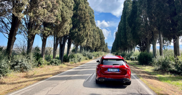 Passato il viale di cipressi caro al Carducci, poco dopo Bolgheri in direzione Sassetta, la strada sale tra le colline tra mille curve. Selezionata la mappatura Sport Plus grazie alla posizione di guida bassa, la trazione posteriore, il cambio doppia frizione 9G-Tronic a 9 rapporti e la spinta supplementare dell’unità elettrica, i passaggi nel misto sono briosi. Il baricentro particolarmente basso, a cui contribuisce il peso dell’unità elettrica, dona una maggior tenuta di strada e stabilità.