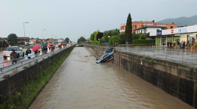 Strade trasformate in torrenti nel Bresciano dopo temporale: crollato l’argine del naviglio. Una famiglia isolata a Lavenone