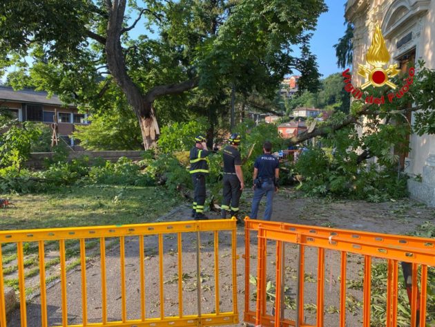 Otto tra bambini e genitori sono rimasti feriti da un grosso ramo di ippocastano caduto davanti all’oratorio di Luino, in provincia di Varese. I ragazzini stavano uscendo dalla struttura quando sono stati travolti dal ramo. Madre e figlia sono rimaste ferite in modo grave. La donna, la più grave, per proteggere la figlia di sette anni si è lanciata su di lei, riportando un grave trauma alla schiena, al volto e alle braccia. La piccola a sua volta alle braccia e al torace.