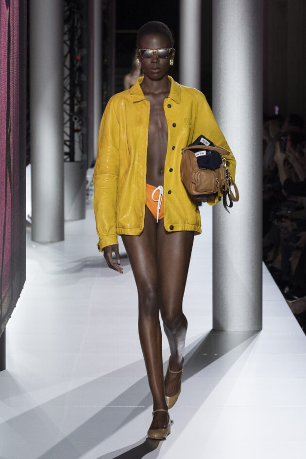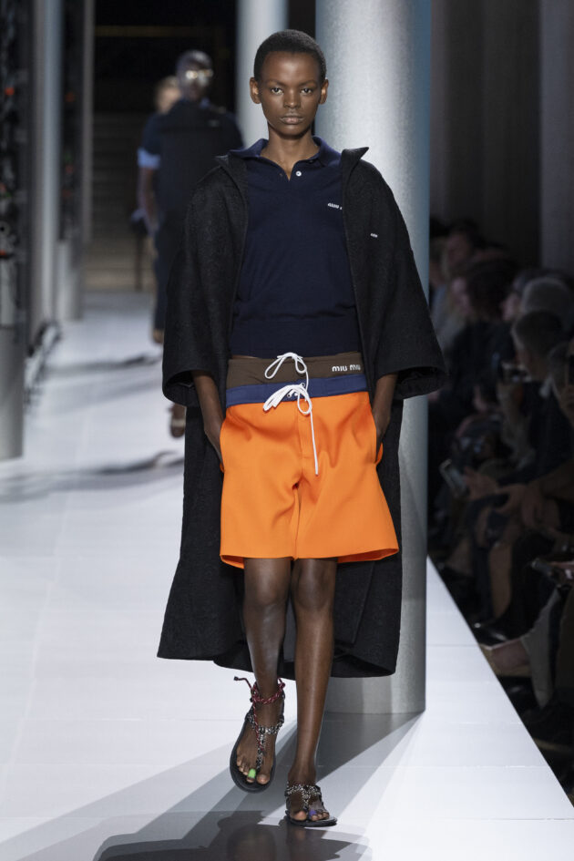 Il risultato sono giustapposizioni audaci e uno stile moderno che riflette la diversità delle identità contemporanee e l’apertura alle infinite possibilità di oggi. La collezione presenta una vasta gamma di capi, dai costumi da bagno all’abbigliamento sportivo, dalle giacca college ai giacconi over, dagli abiti da sera ai jeans, dalle micro-gonne ai pantaloni a vita bassa. E poi ancora, ecco che ritroviamo i micropants, capo simbolo di quest’autunno-inverno, e grandi borse da usare per la vita. Questa pluralità di ideali di bellezza è rappresentata attraverso combinazioni sorprendenti e audaci. I colori chiave sono quelli propri di Miuccia, il blu, il marrone e il grigio in primis; ma anche tocchi di giallo ocra, di arancio, di azzurro, verde e rosso; calibrati e mixati per trasmettere una vibrante energia. C’è una varietà e una trasversalità tali che possiamo definire questo guardaroba iper-inclusivo nel senso più letterale del termine: chiunque guardandolo vi trova un pezzo, che sia una maglia o un accessorio, che sente proprio, familiare.